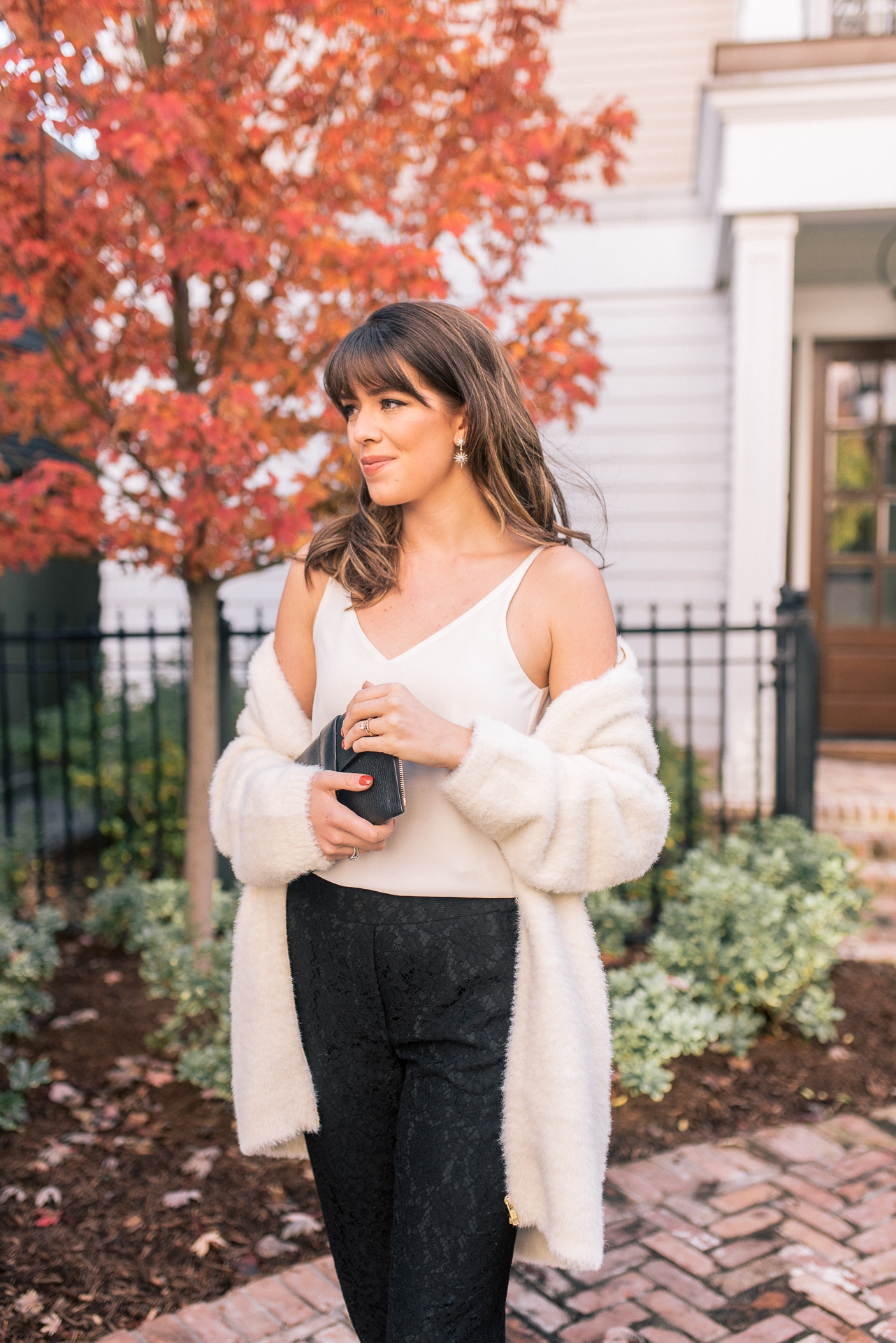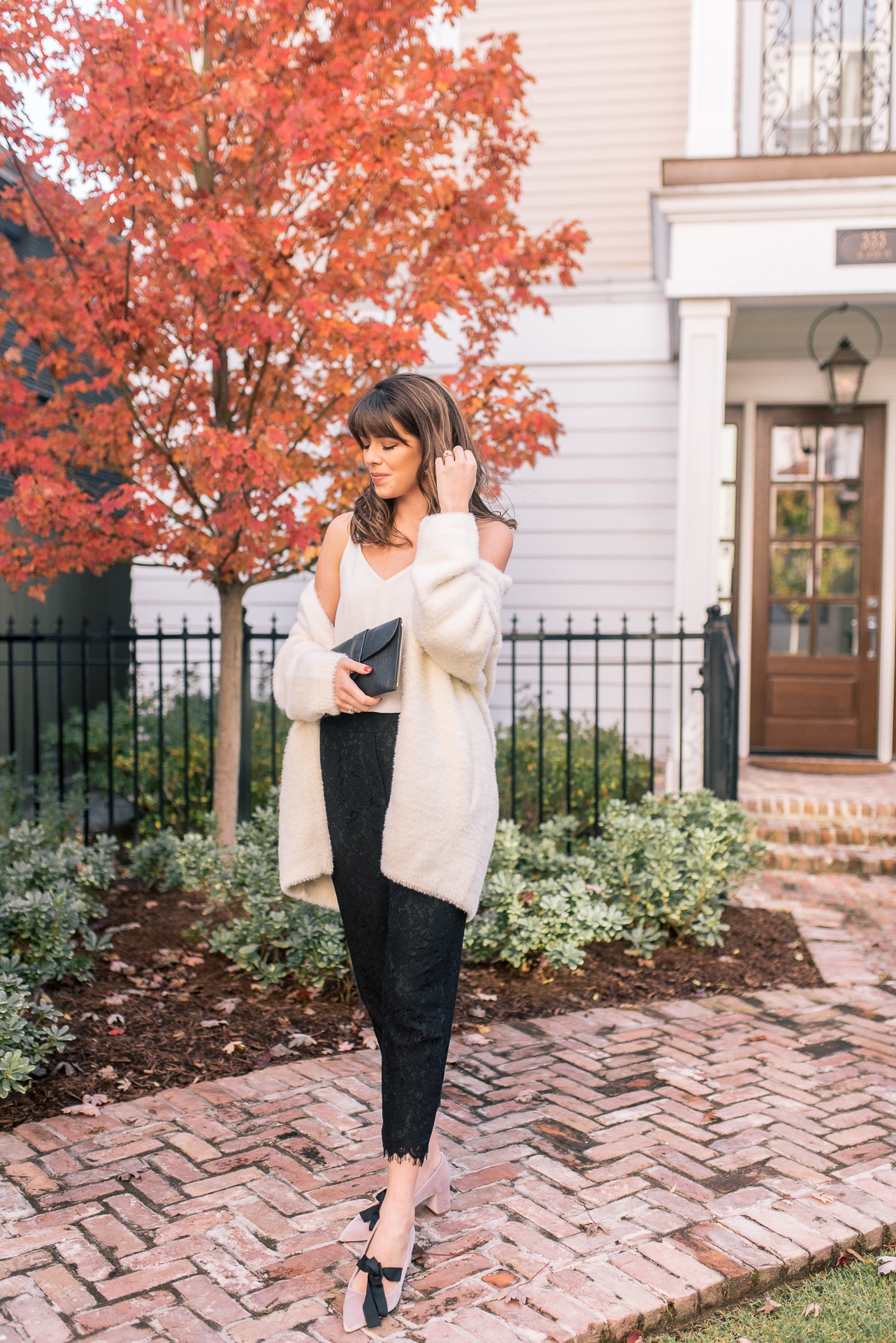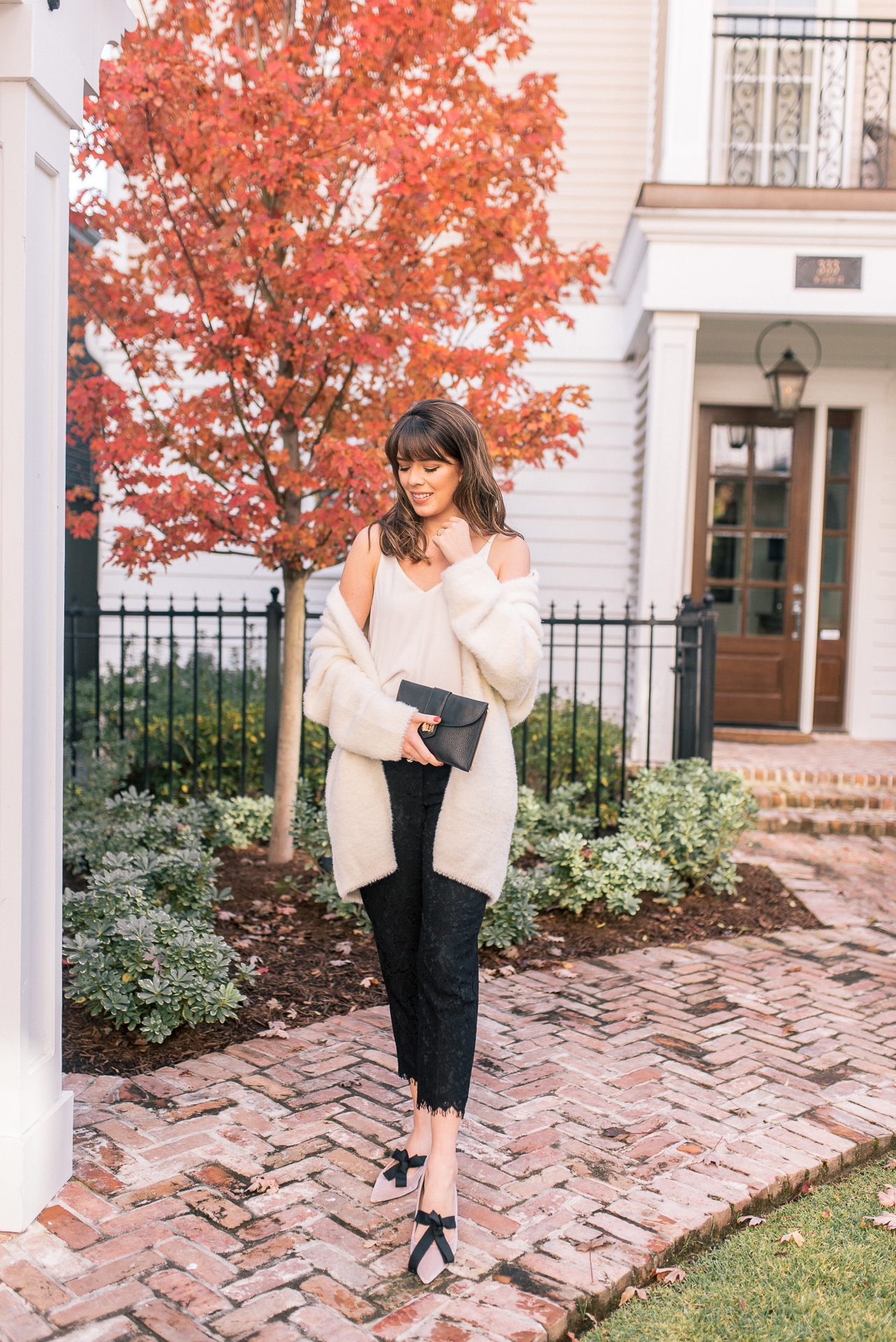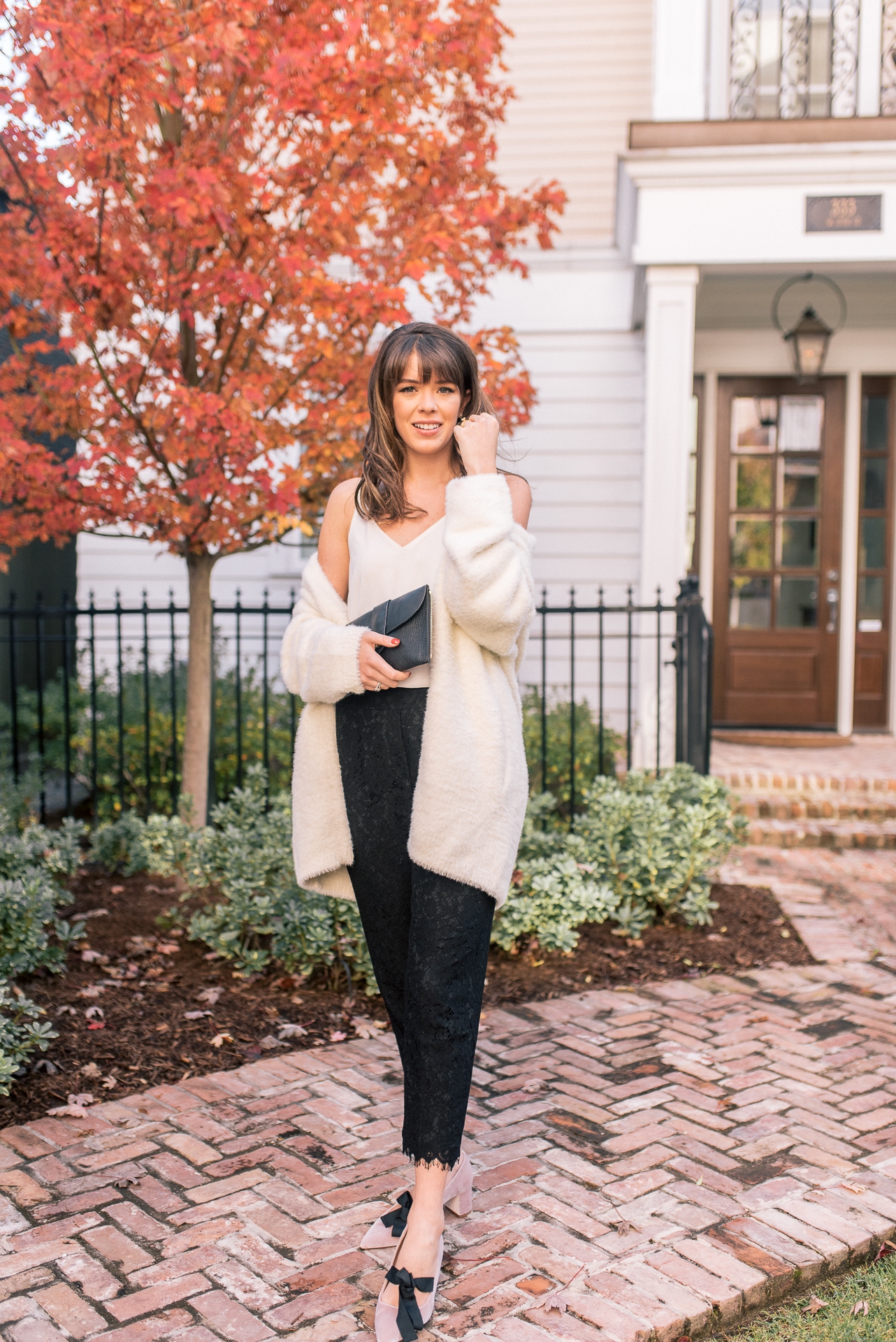 Fuzzy Cardigan: J.Crew | White Tank: Nordstrom | Black Lace Pants: J.Crew |Pink Bow Detailed Shoes: Nordstrom | Clutch: Nordstrom