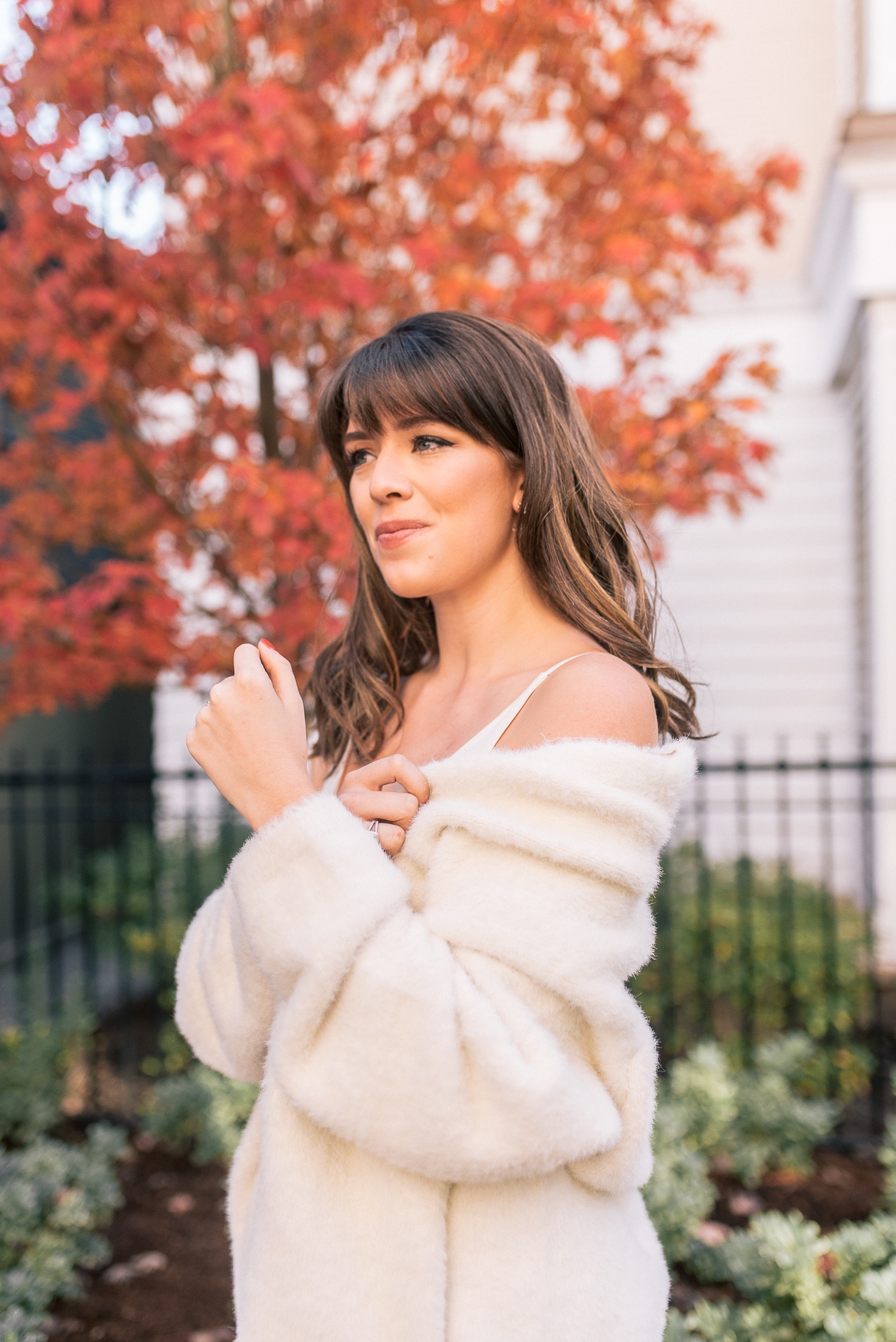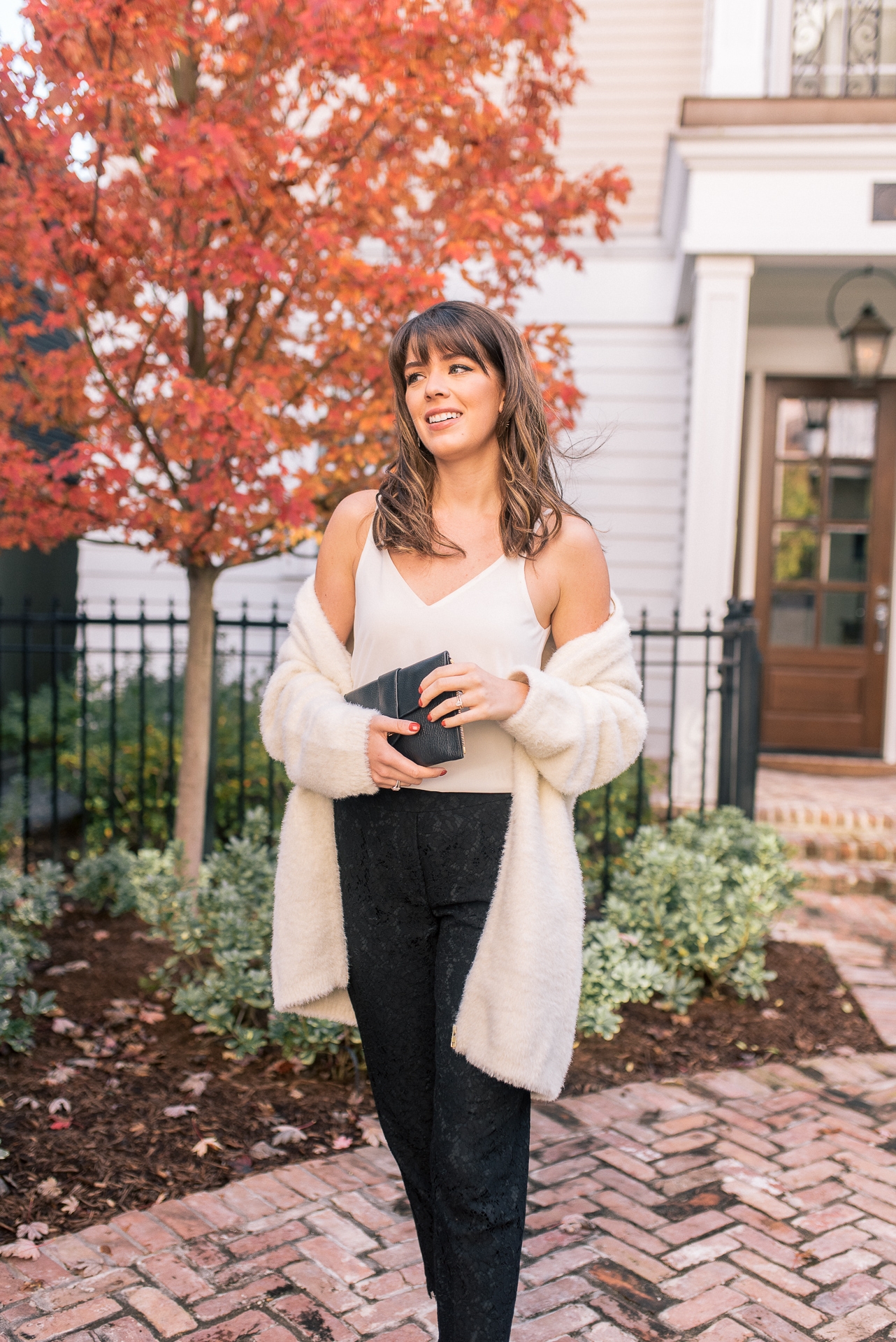 Before heading to eat way to much Thanksgiving food, I had to share this gorgeous cozy holiday look. 😉 I recently found this fuzzy cardigan the other day and knew I had to add it to my closet. It is extremely warm and the softest cardigan you will ever wear. To dress it up for the holidays, I styled it off the shoulders and paired it with a simple white tank, lace pants, and pink bow detailed shoes. The perfect outfit to wear to any holiday party or event this season. All these items are currently on sale and apart of Cyber Week. Grab them this week to take advantage of the low prices.