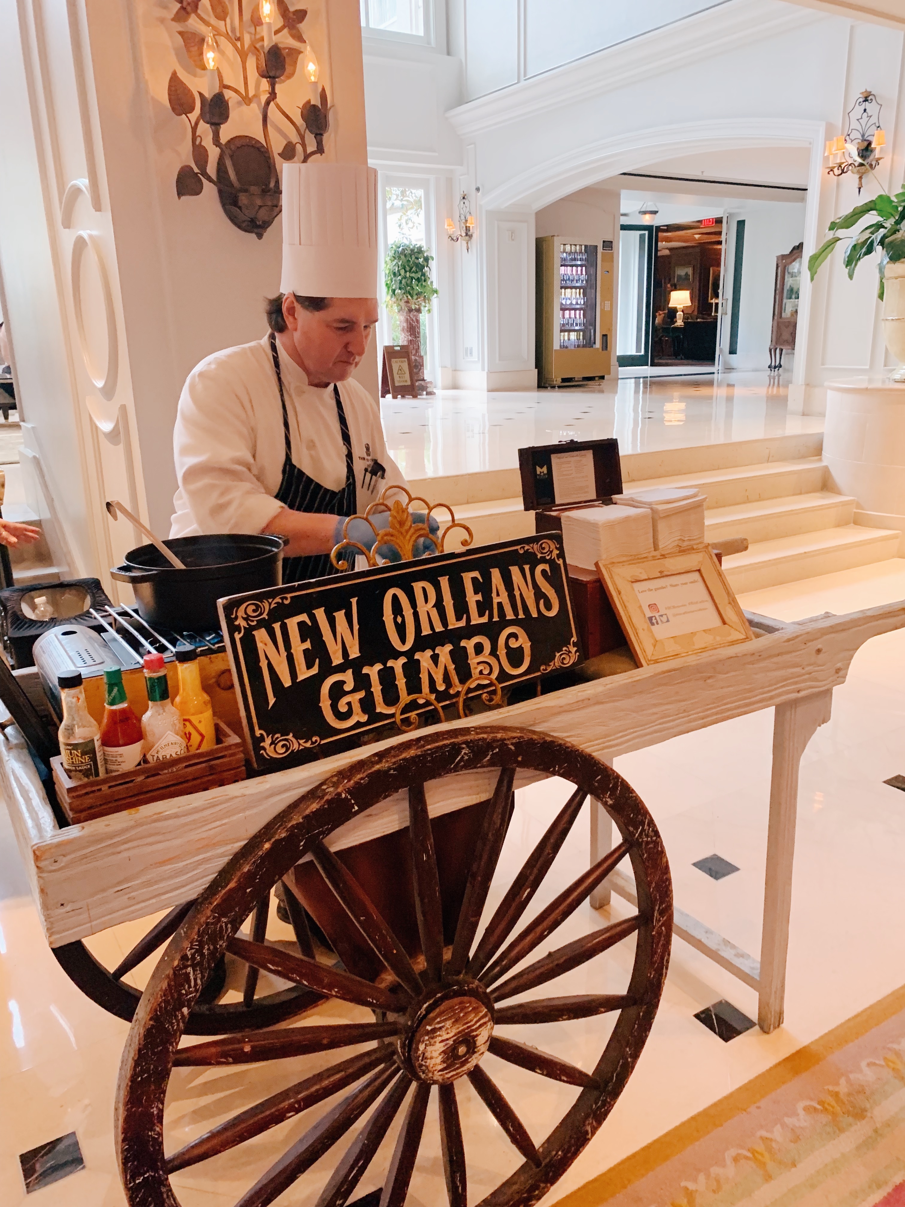 You enter in on street level and take the elevators up to the 3rd floor to check in. This floor is filled with the most beautiful floral arrangements, and sounds of jazz music. Around happy hour, you can find a gumbo cart with the most delicious gumbo served. We loved this feature, SO fun and yummy!