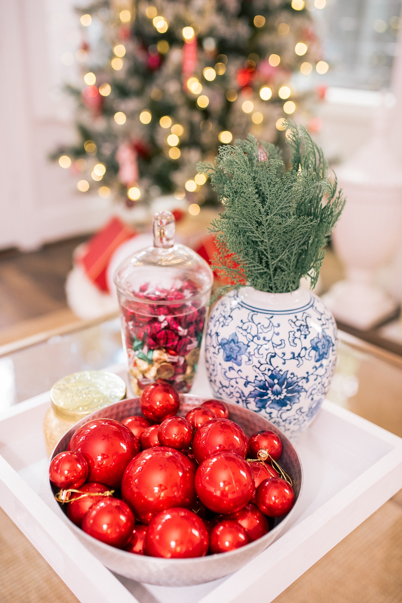 For our coffee table I simply just added a jar of candy, a holiday candle, placed some faux cedar stems within a vase and put some extra Christmas ornaments in a pretty bowl. Super easy and yet still makes a statement.