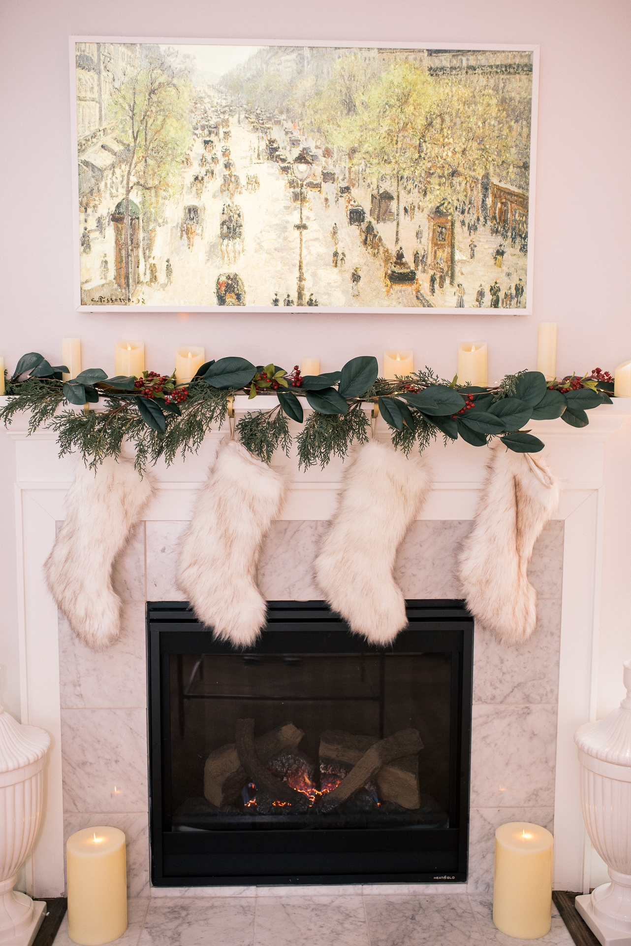 Our mantel was one of my favorite spots to decorate this year. Since I was a little girl I dreamed of having my own fire place to decorate and hang stockings. With our growing family we invested in new stockings this year and I went with neutral faux fur to enhance that cozy, cottage look I was trying to achieve. For the mantel itself I mixed in several different garland to achieve the look I wanted. I mixed faux Cypress, and Magnolia garland then added pops of red berry stems. To finish it off, I bought a variety of battery operated candles to turn on in the evening.