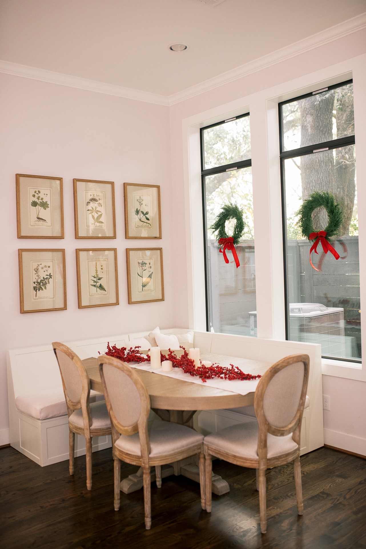 Our kitchen and dining area was SO fun to decorate. With our big open windows I knew I had to add some beautiful wreaths. Luckly I found these at Target and bought some red ribbon on Amazon to add to them for a nice holiday touch. To keep our holiday center piece simple I added a pretty red berry garland and an assortment of candles to light when guests come over.