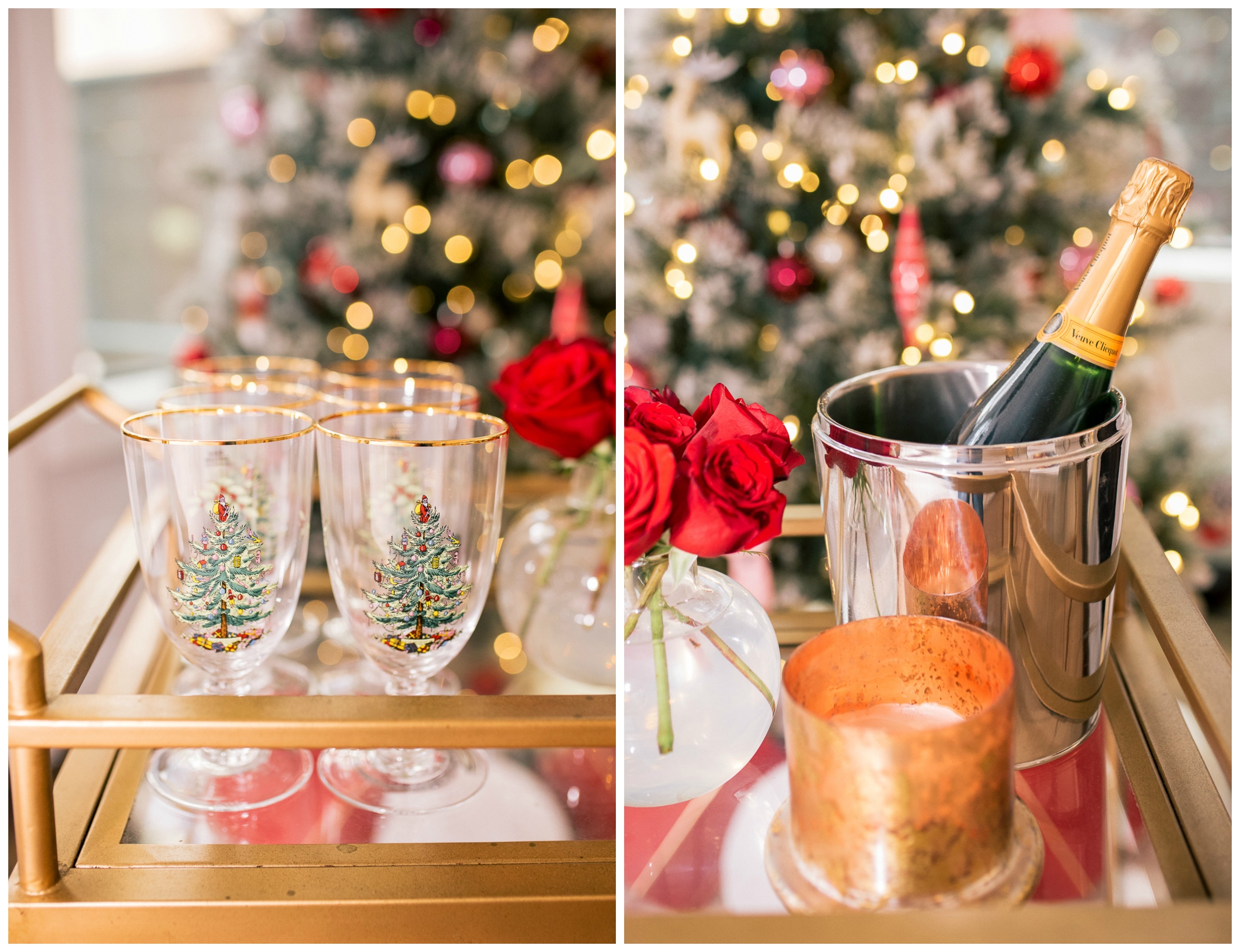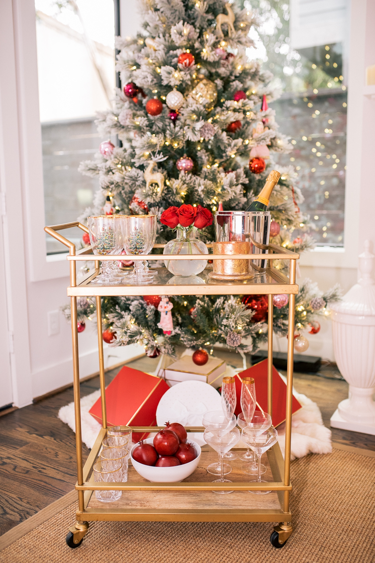 A holiday bar cart is always so fun! I wanted to keep it simple, classic, and elegant. I played around with our glassware, and incorporated pops of red by adding pomegranates, and flowers. To top of the holiday bar cart I picked up these adorable Christmas glassware from Home Goods and added a bottle of champagne. Nothing says the holidays like Champagne. 😉