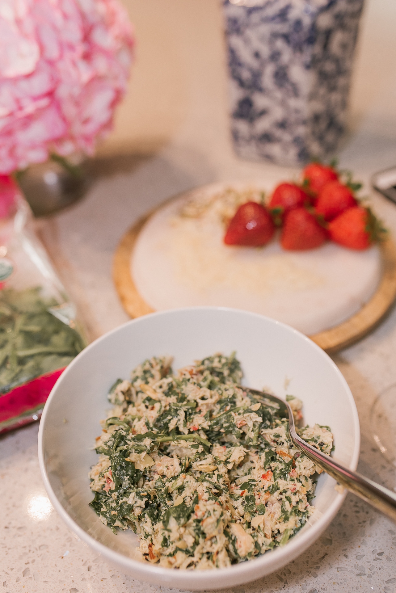 - 1/4 cup of roasted almonds or two packets of the seedy almond salad topper from Trader Joes
