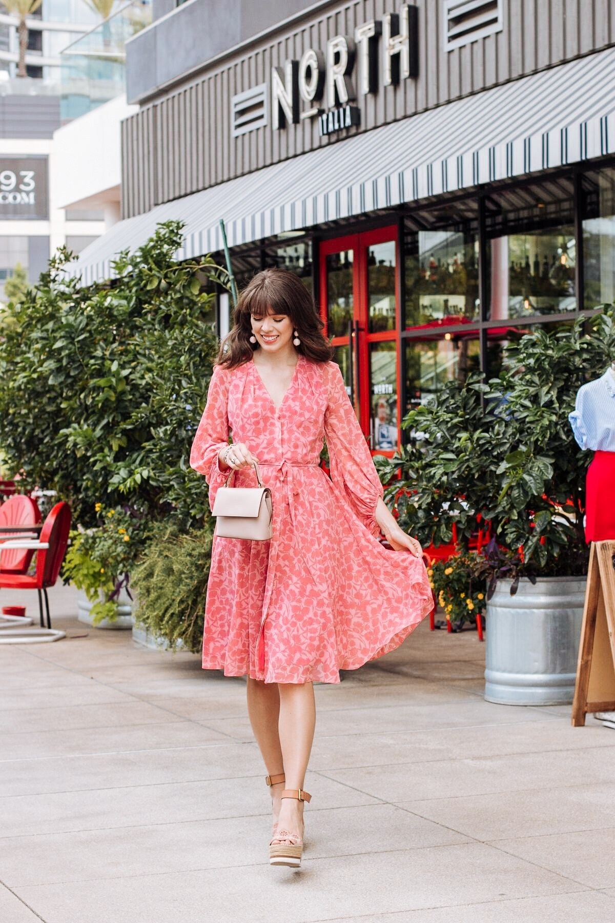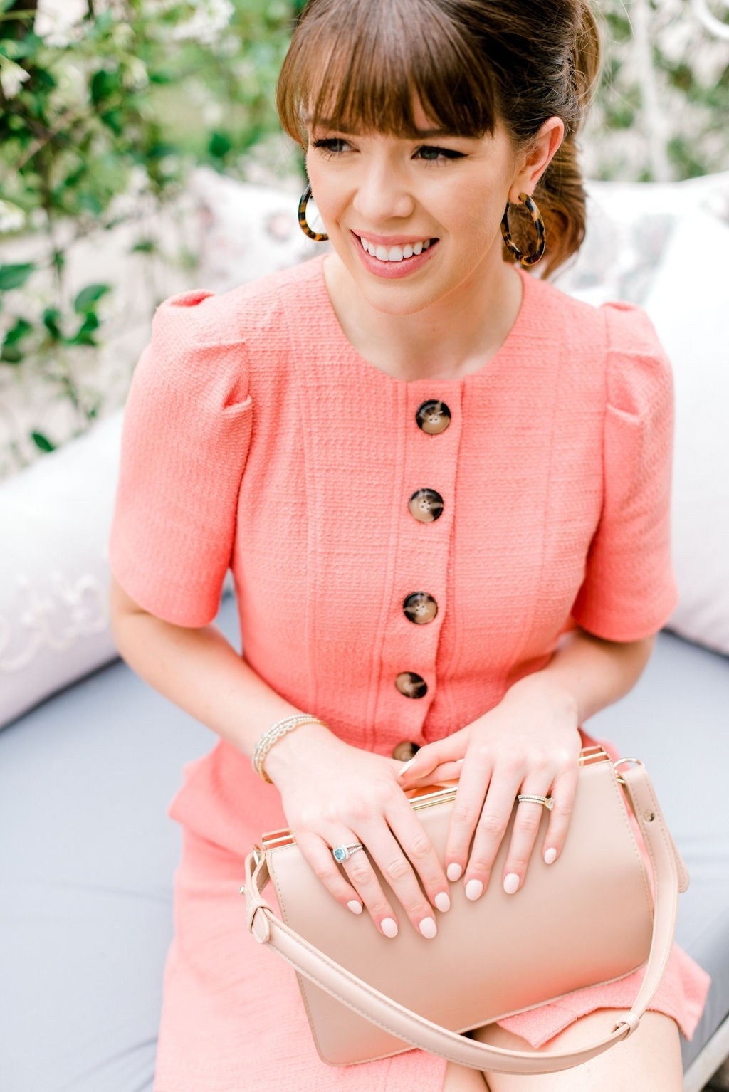 The Kathleen dress quickly became a staple piece in my closet throughout the Spring and Summer seasons. From lunch dates, engagement parties, and more this has been a well loved dress. The salmon color makes this dress such a beautiful addition to any closet. ( Size: Size down, I’m wearing a 0 )