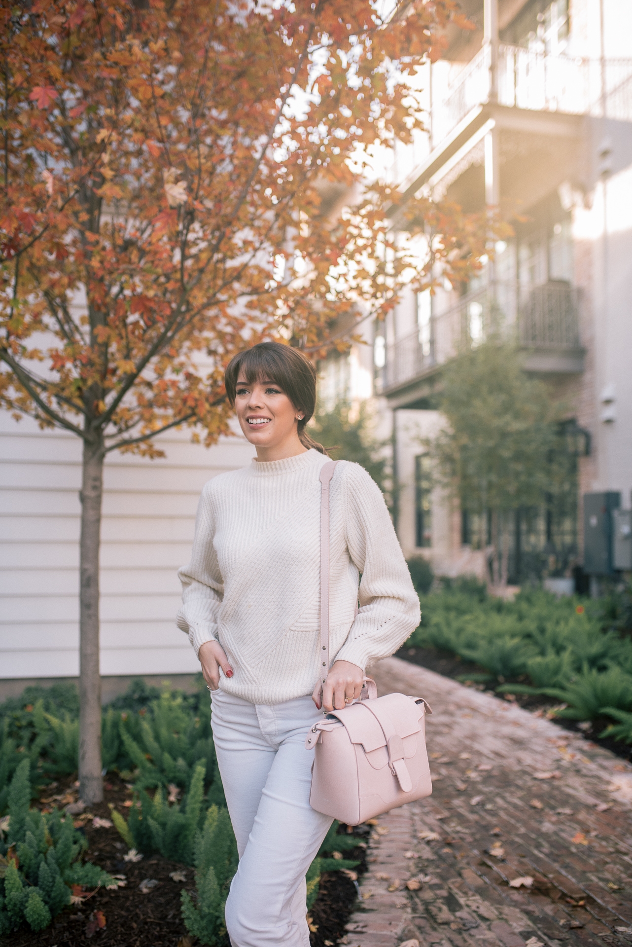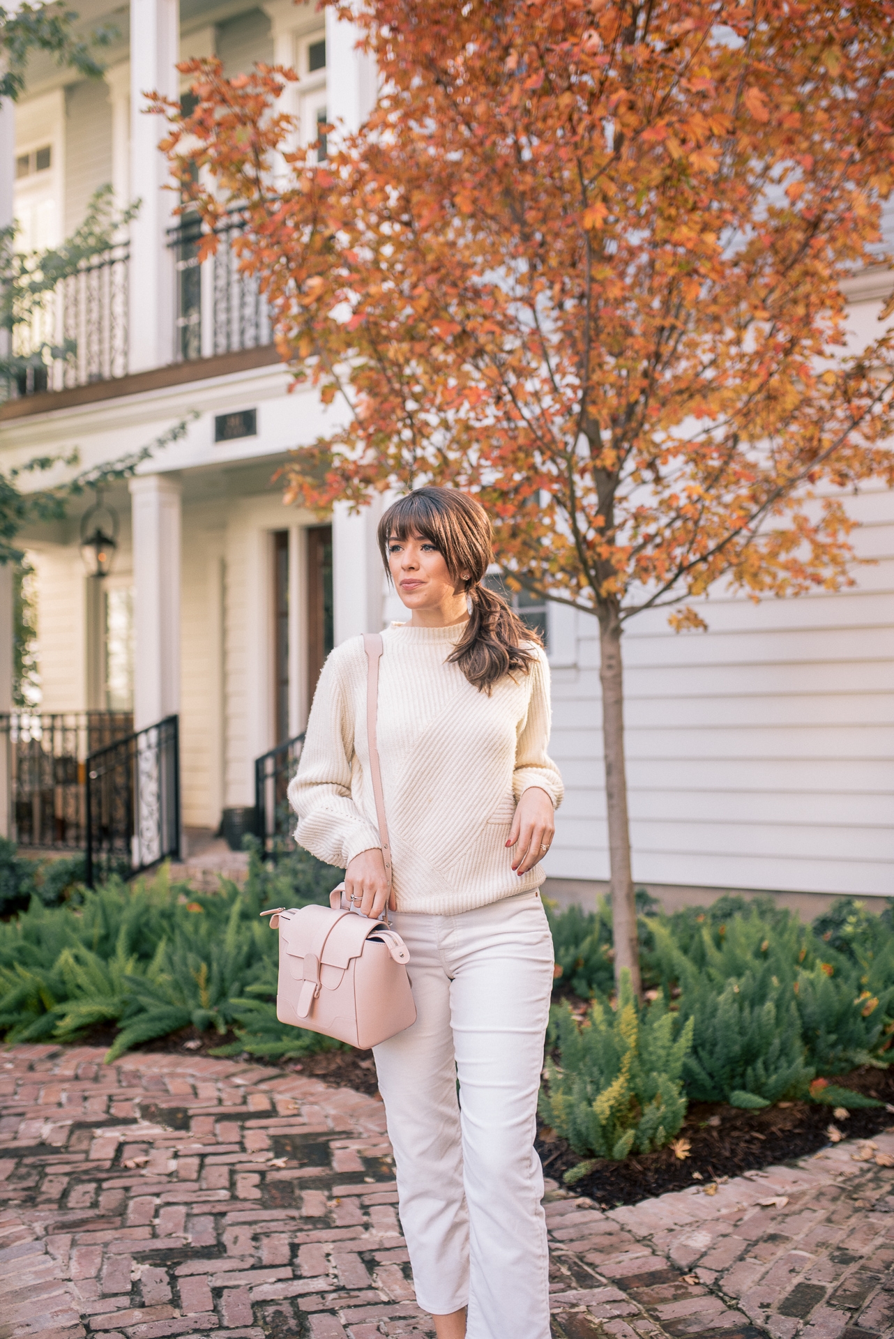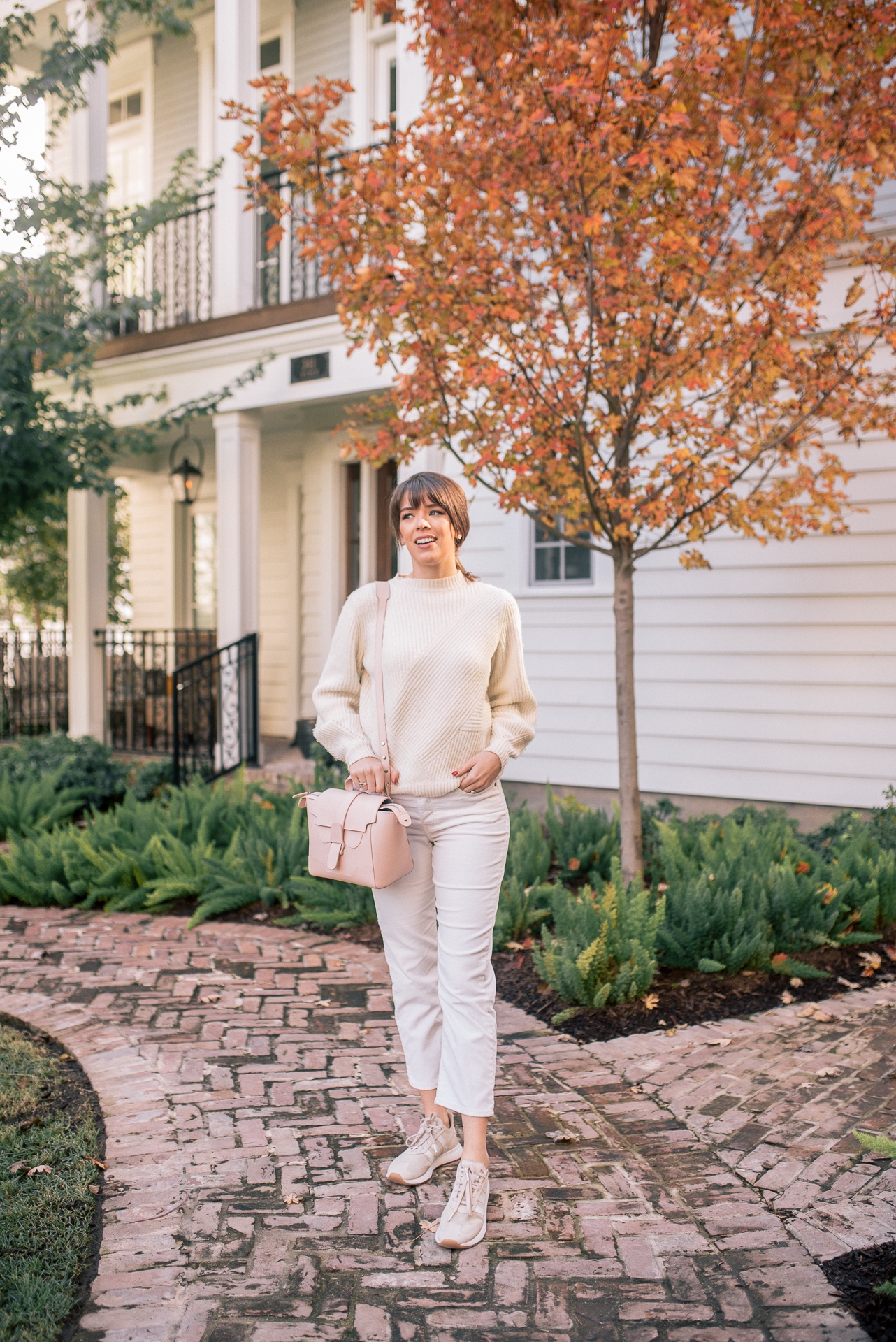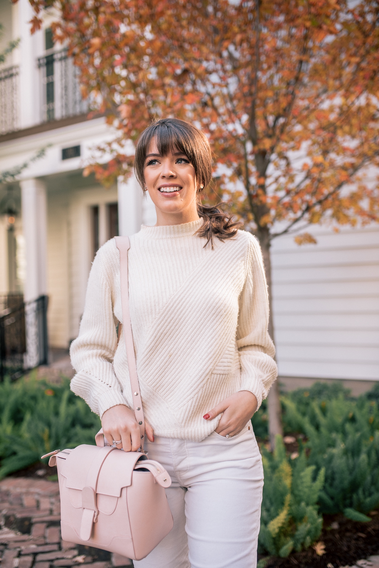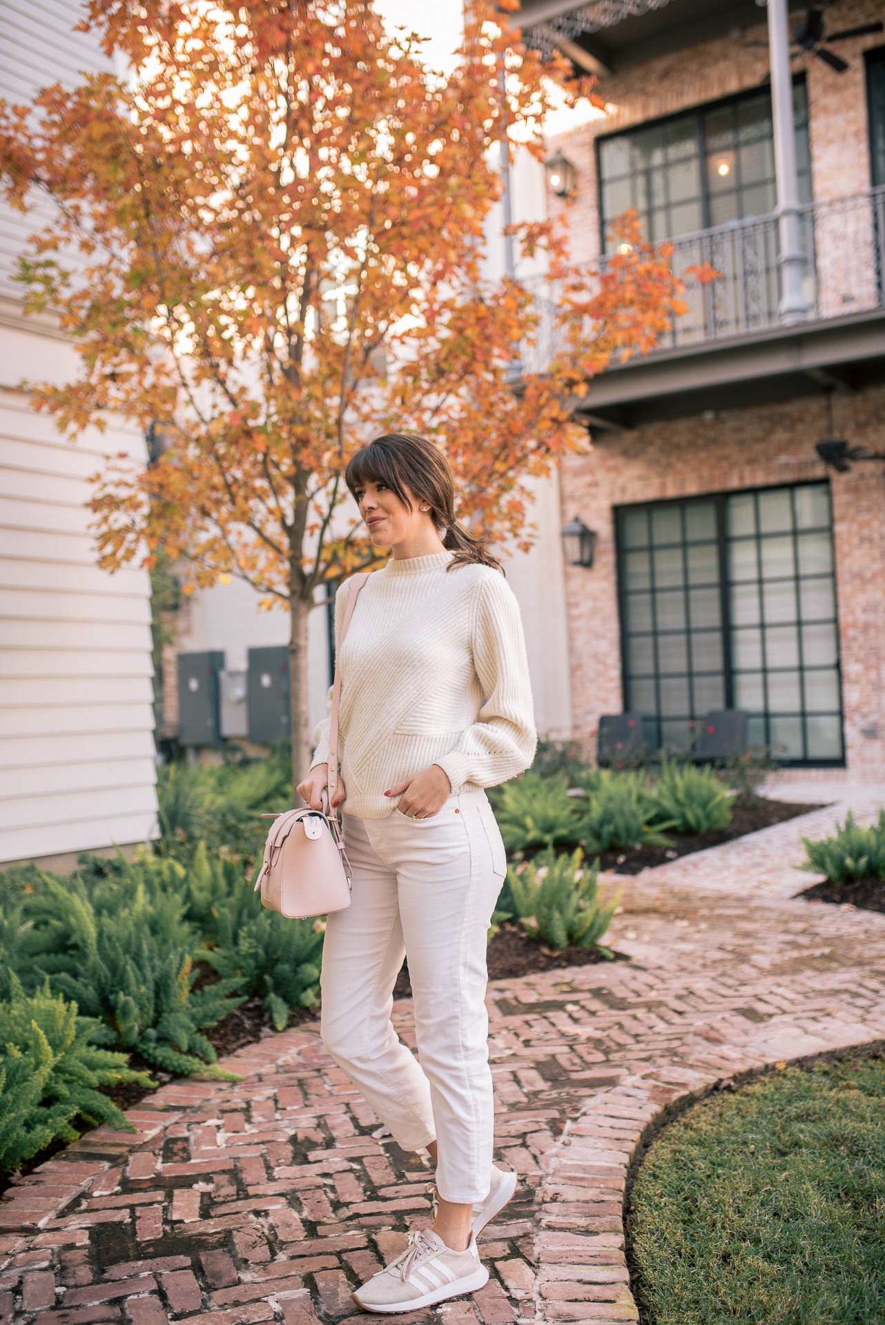 This all white winter look has been my go to travel look throughout the past few weeks and will continue to be throughout the holidays. When traveling in the winter you want to make sure that you wear warm pieces, but not too many layers that will cause you to travel uncomfortably. That is why I LOVE this white wool sweater and corduroy jeans. It is simple, warm, and extremely comfortable. The monochromatic look adds a chic touch that will allow you to go from the plane straight to dinner or drinks with your loved ones. I added my favorite Adidas tennis shoes to ensure for fast and easy travel. Walking or running to the your plane in boots is no fun! Trust me, I have tried it. 😉 To top the entire look off I added my new favorite blush pink bag to travel with. I love it because not only can you wear it as a crossbody but also a backpack. Making it the perfect travel piece!