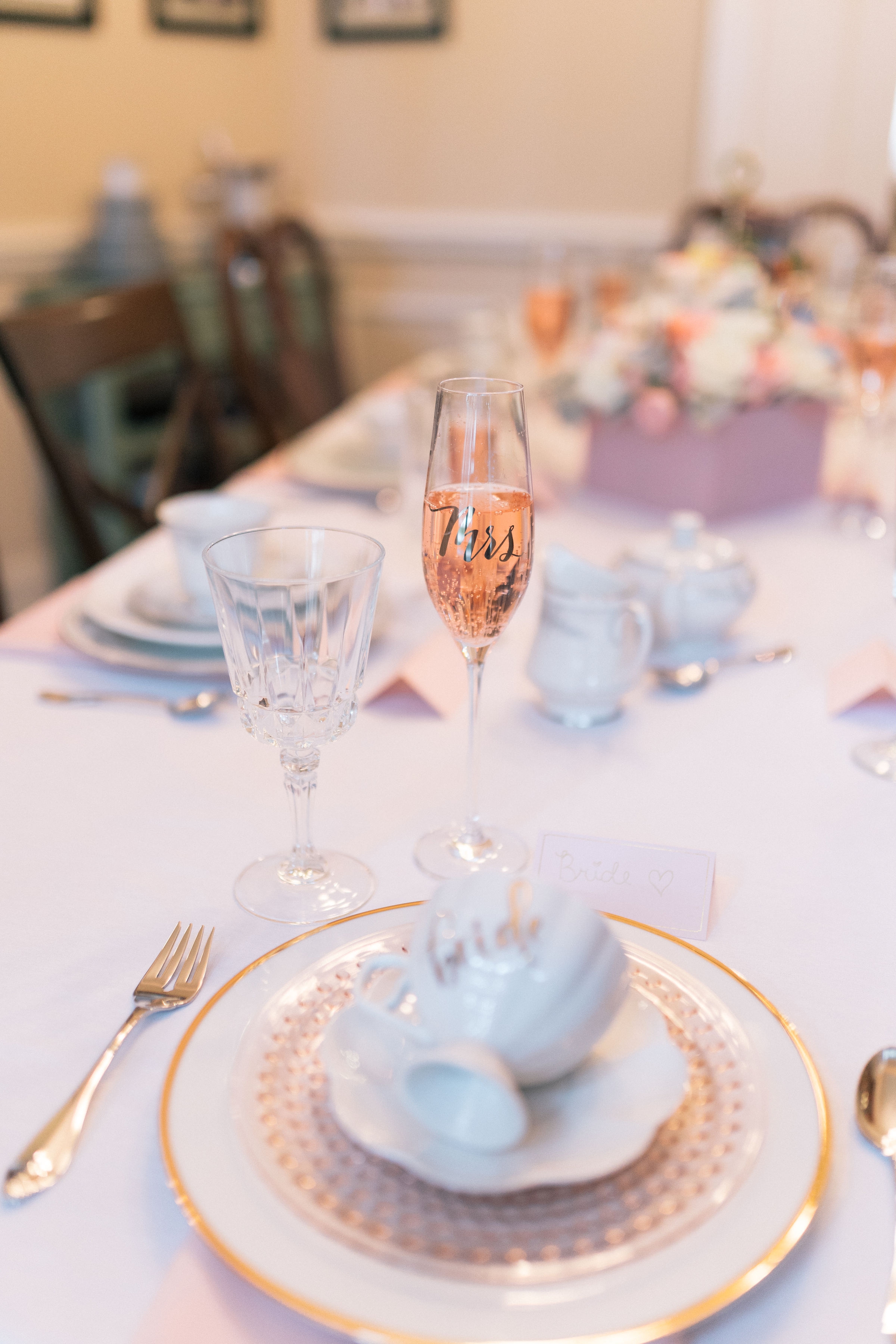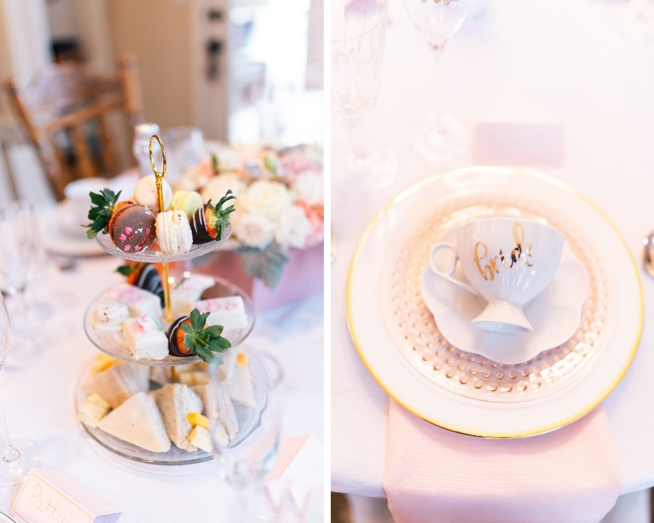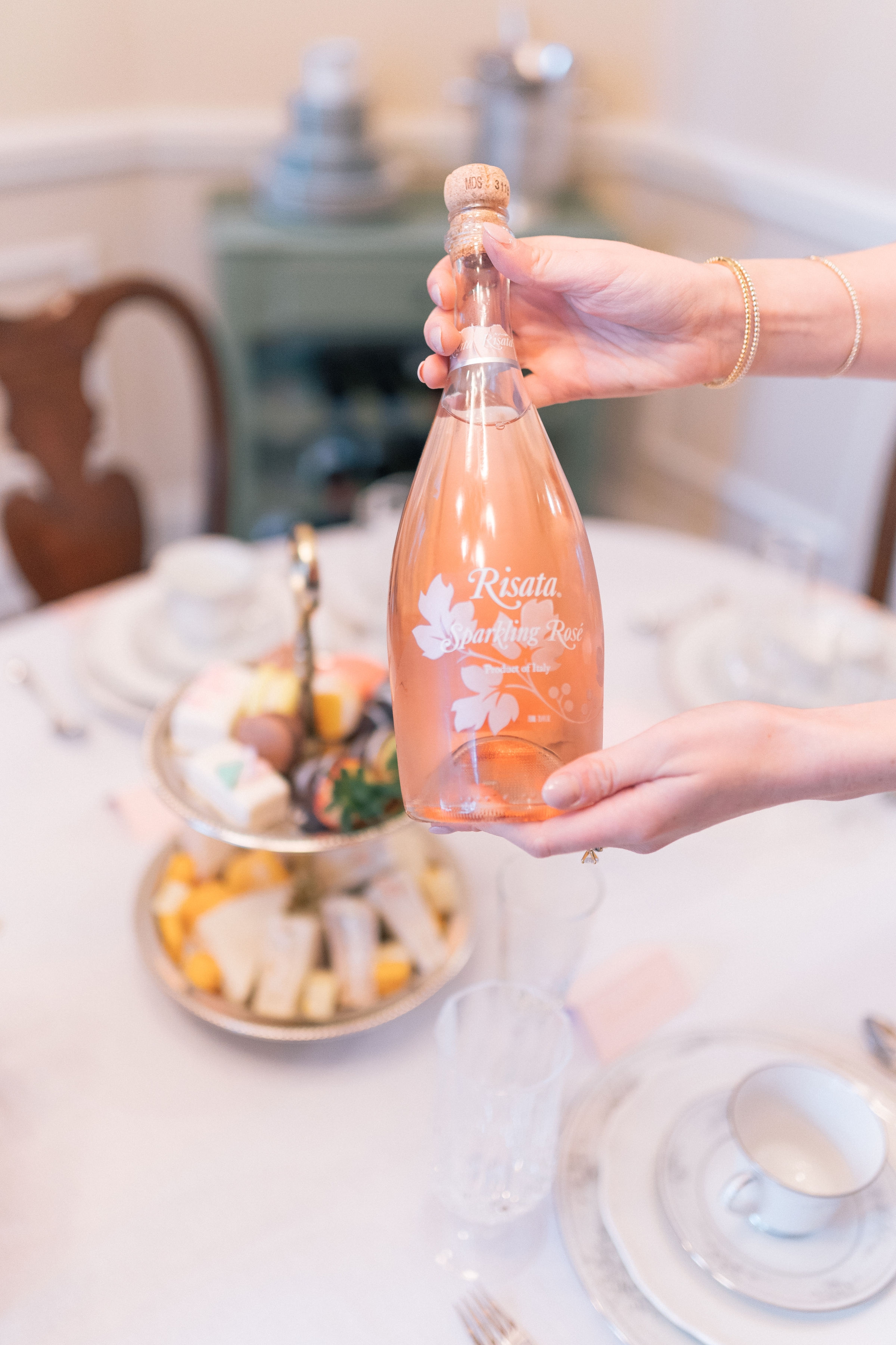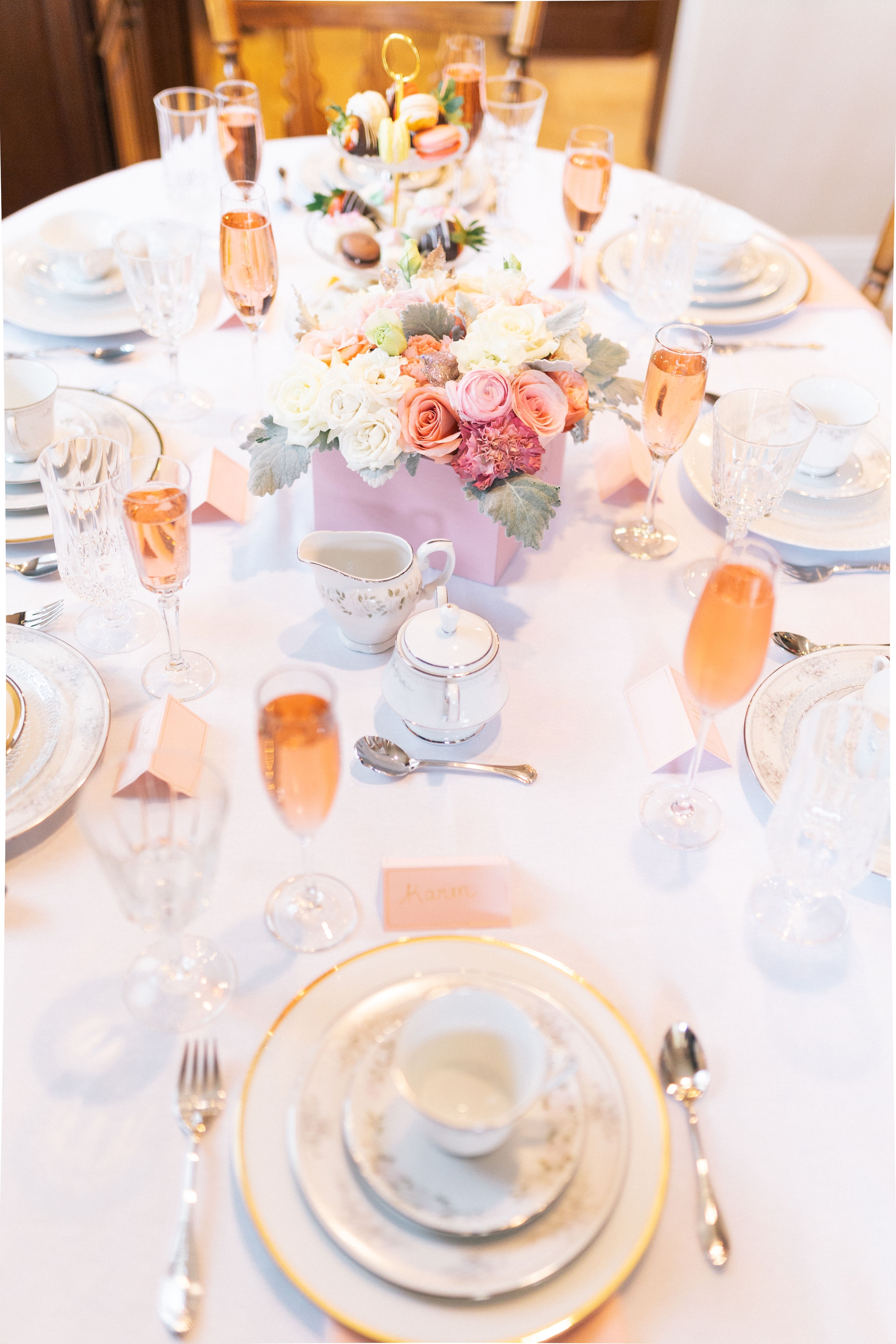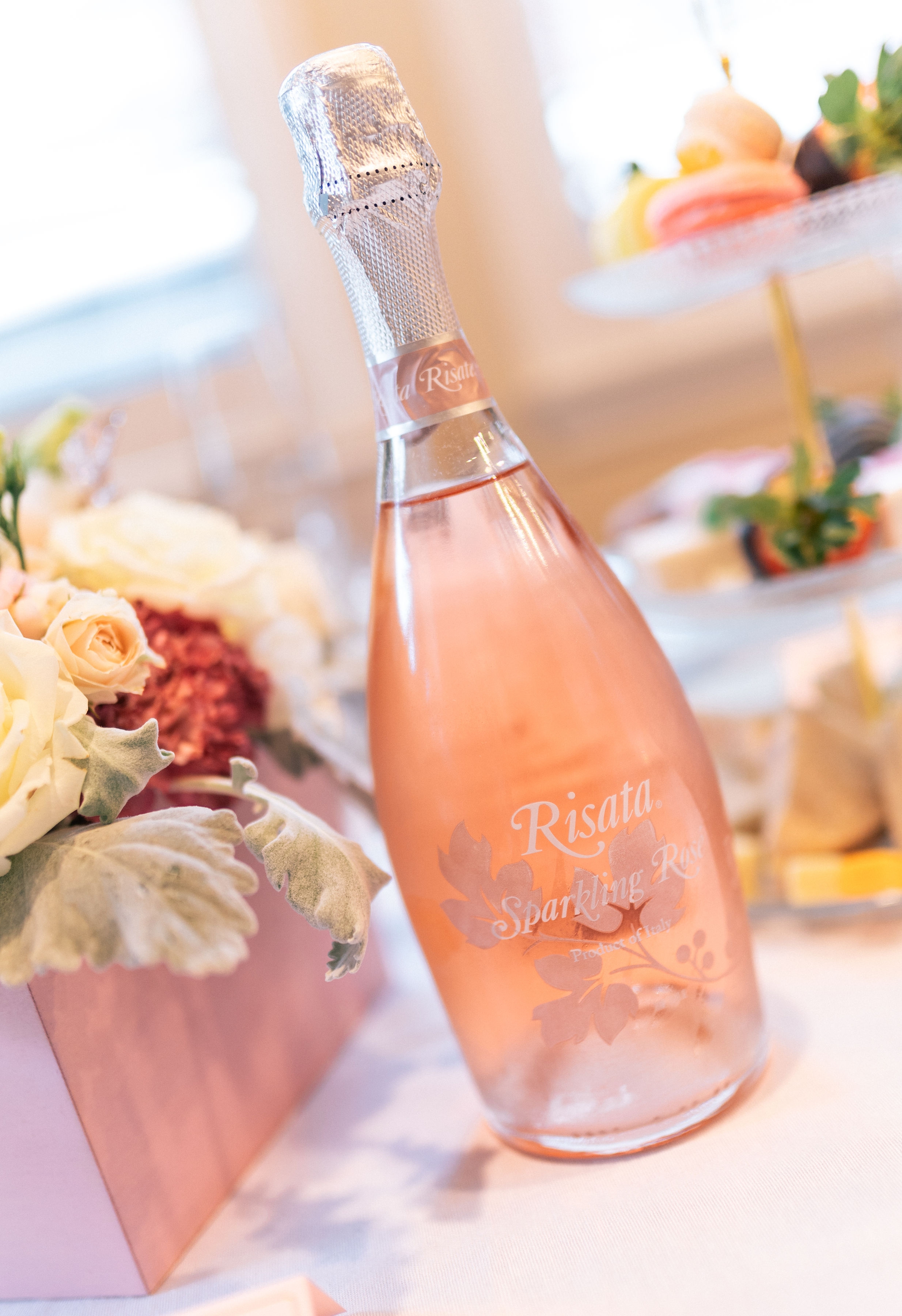 Since we wanted everyone to enjoy a beautiful high tea together we made sure to plan and set the tables before everyone arrived. Each place setting included a service plate, a salad plate, cup and saucer, salad fork, teaspoon, napkin, water glass, and champagne glass filled with Risata Sparkling Rosé.
