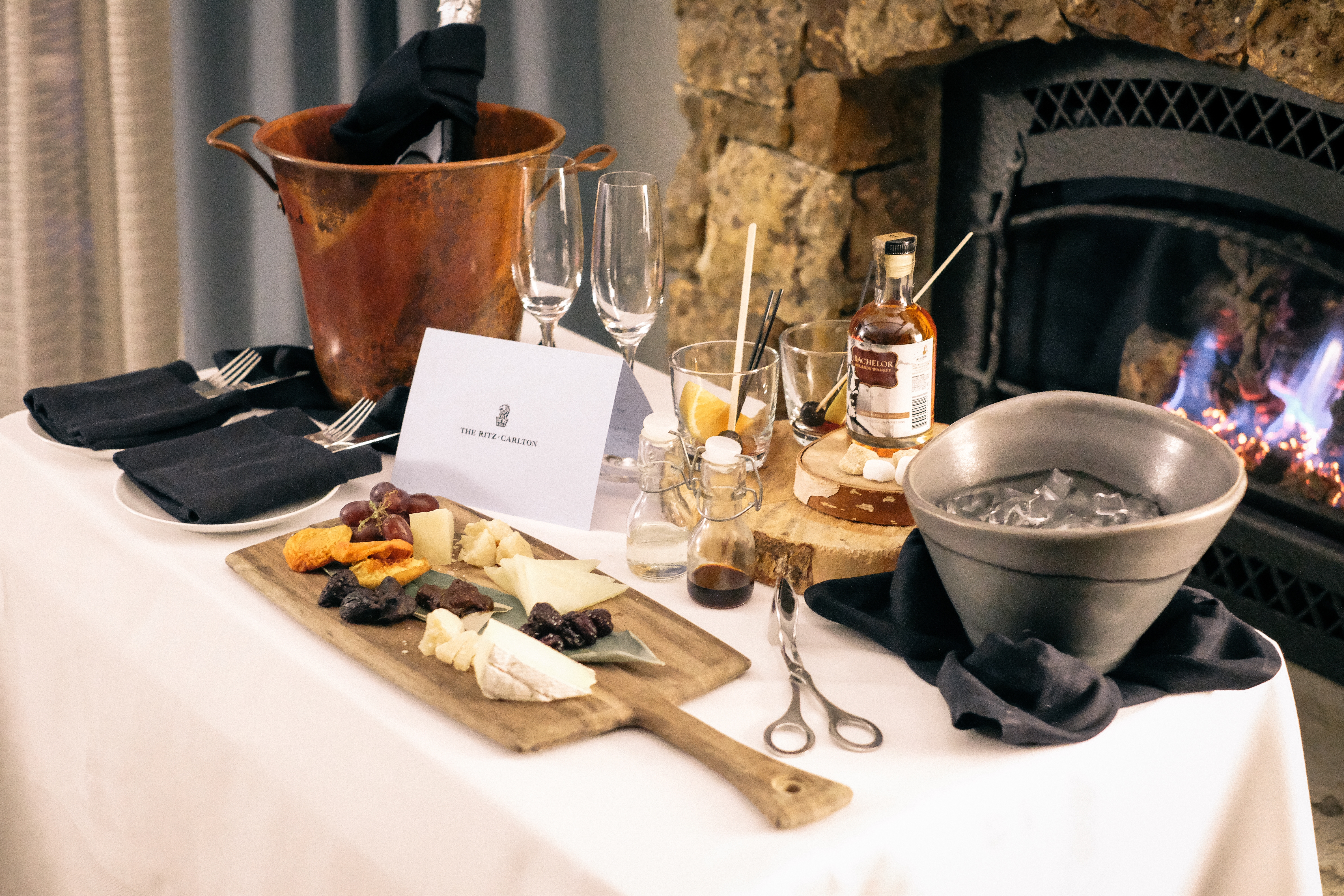 Before heading dinner at Buffalos (one of six of their dining experiences on the property) , we went upstair to our room to change and get ready. Little did we know that their would be a surprise waiting for us in front of the fire. This was just a glimpse into the thoughtfulness of the staff here. They continued to go out of their way to make us feel welcomed and at home. Hunter loved the old fashion kit they had layed out for him. Especially their very own Bachelor Bourbon Whiskey.
