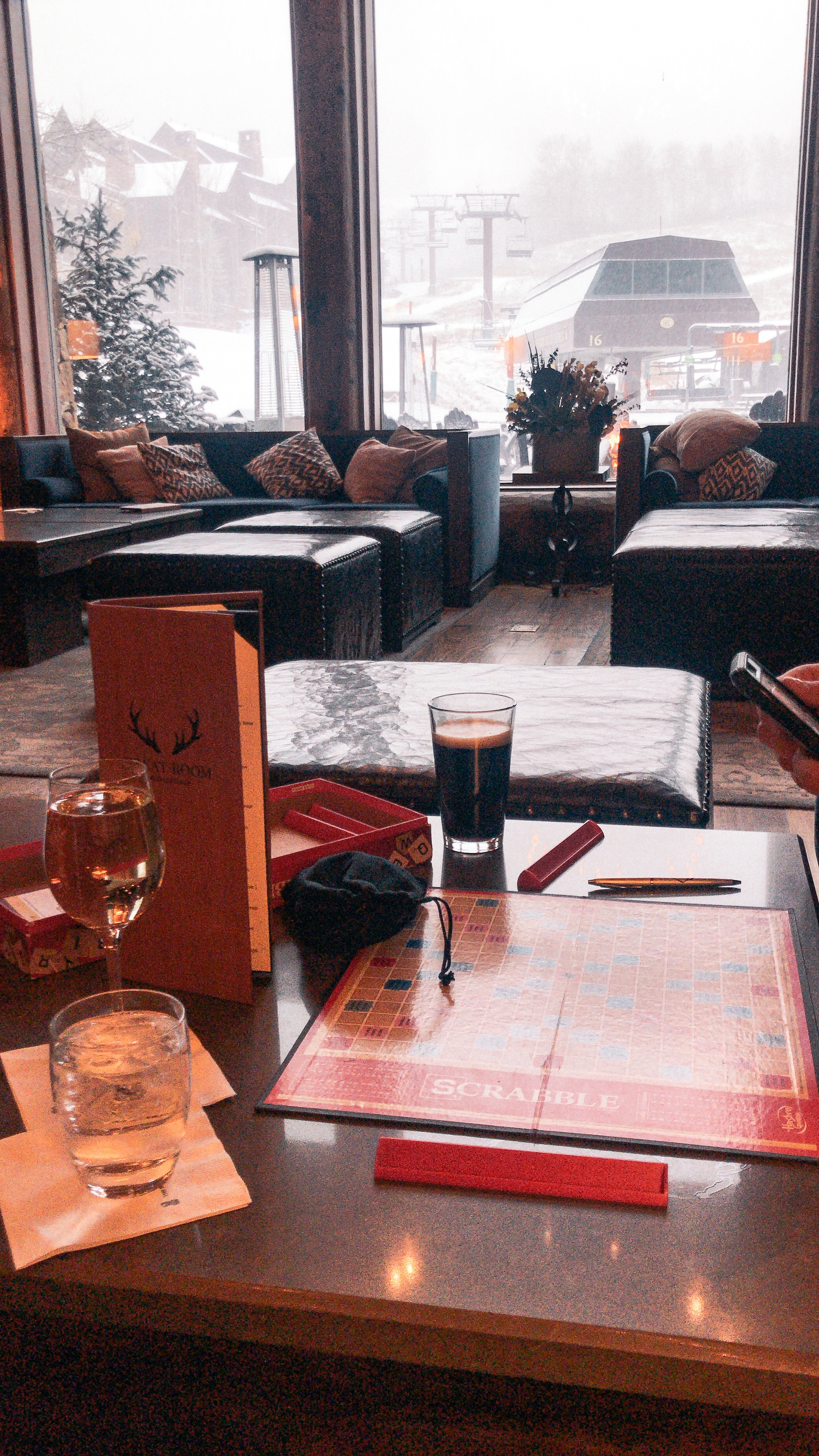 After settling in we headed downstairs to the great room to enjoy a glass of champagne, and watch the Texans VS. Broncos game by the fire. We had no idea that we had timed this trip perfectly to watch both of our favorite teams play each other at Mile High. It was such a fun treat to our day. While watching, we noticed that there were some board games laying out to play. We pulled out scrabble and played for the next few hours as we watched the snow fall from the floor to ceiling windows. Truly felt like we were in a dream!