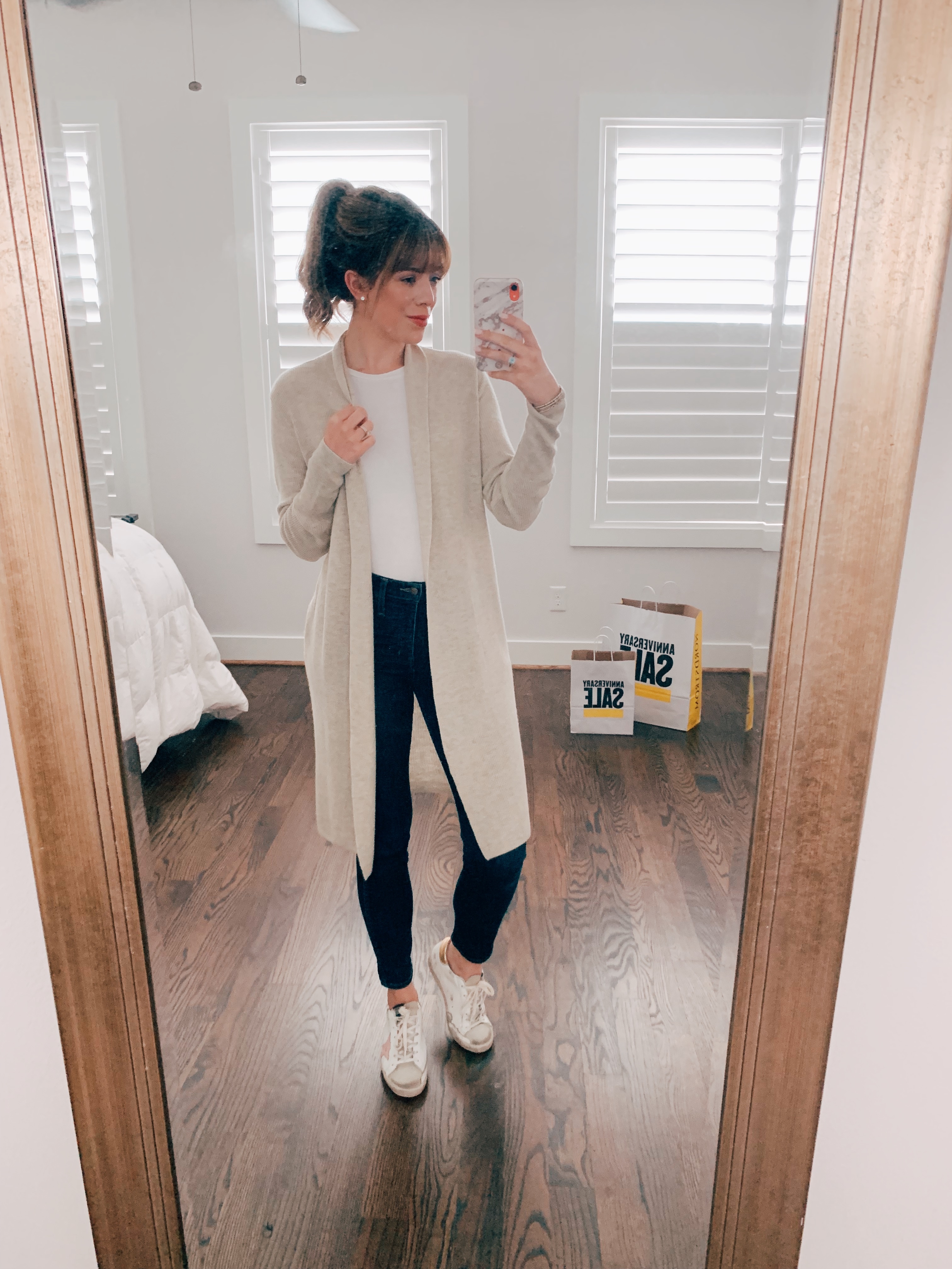 Cardigan: NSale | Tee: NSale | Jeans: Madewell | Golden Goose Sneakers: SSense | Studs: NSale