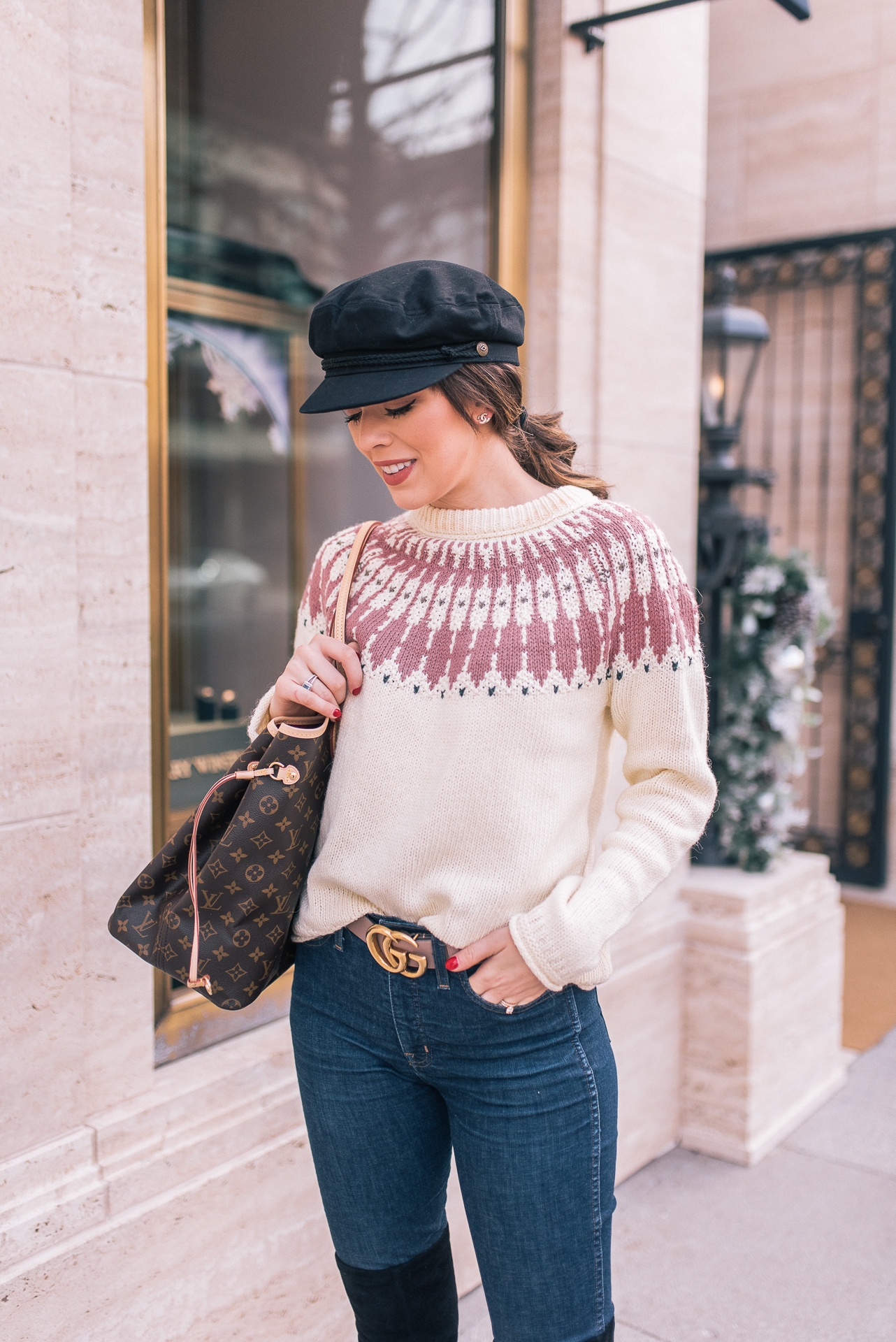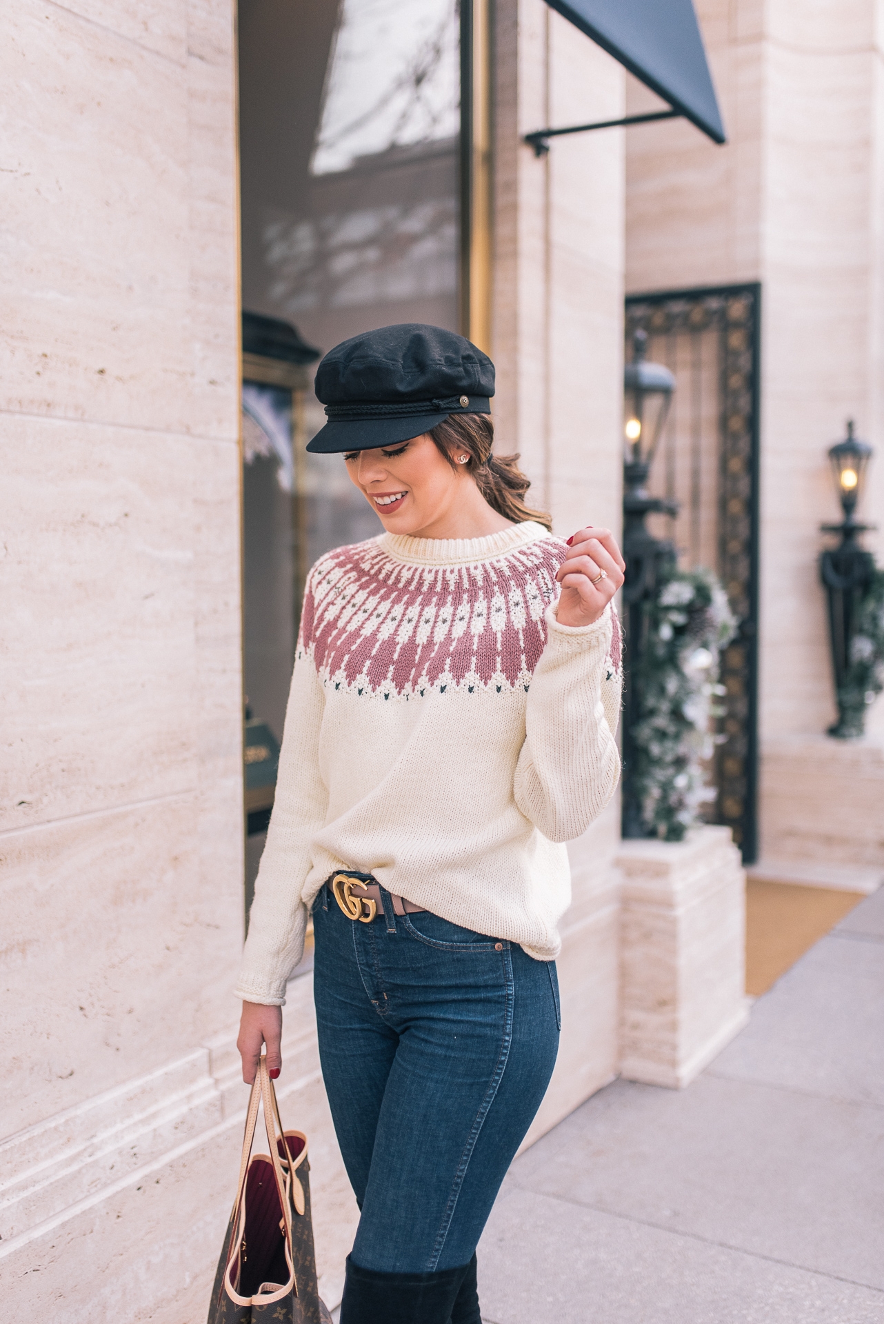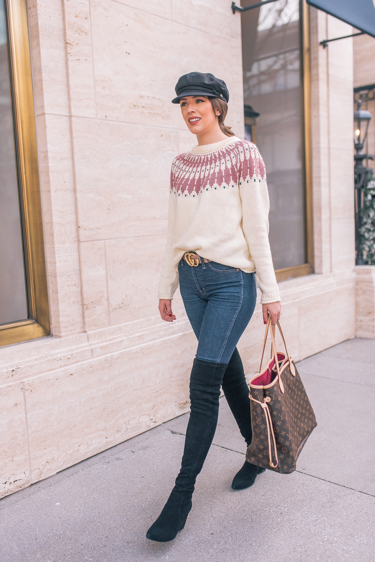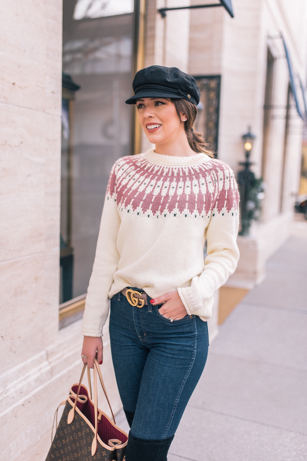 Fair Isle Sweater: Madewell | Jeans: Madewell | OTK Boots: Goodnight Macaroon | Belt: Gucci | Bag: LV Neverfull GM | Hat: Nordstrom | Lip: MAC ( Color-Back to Vogue)