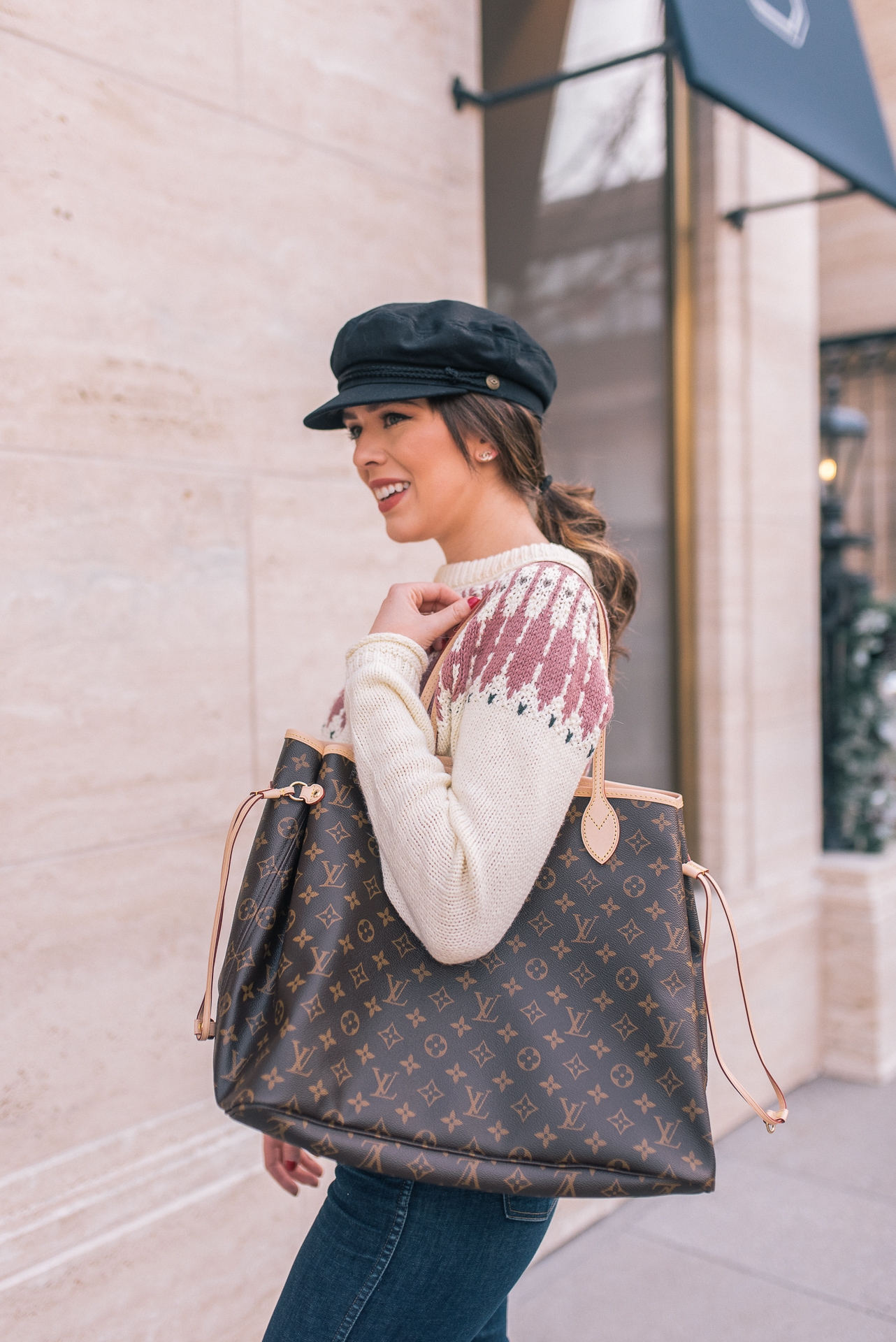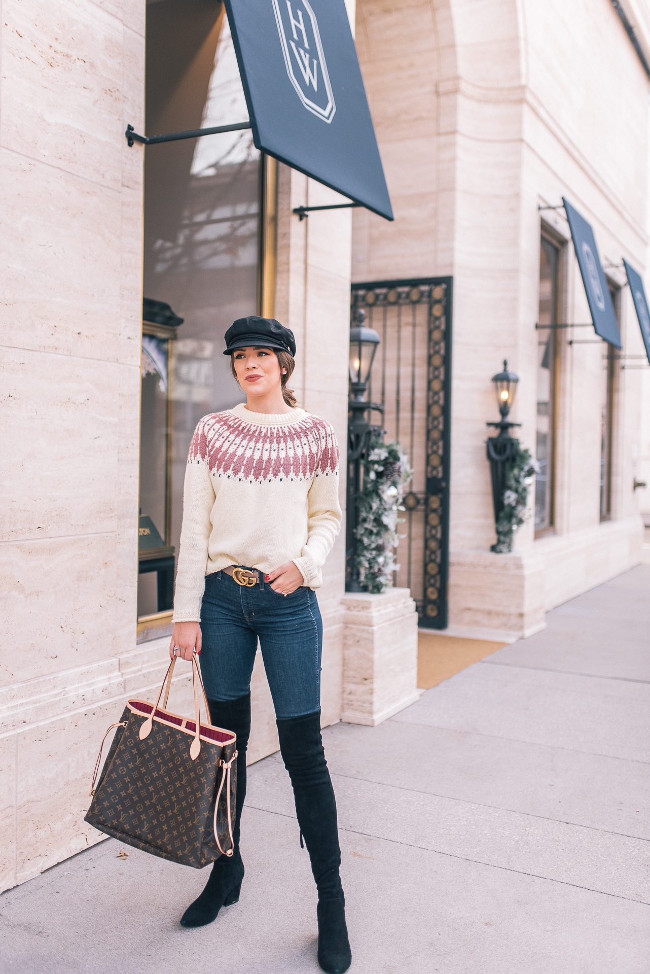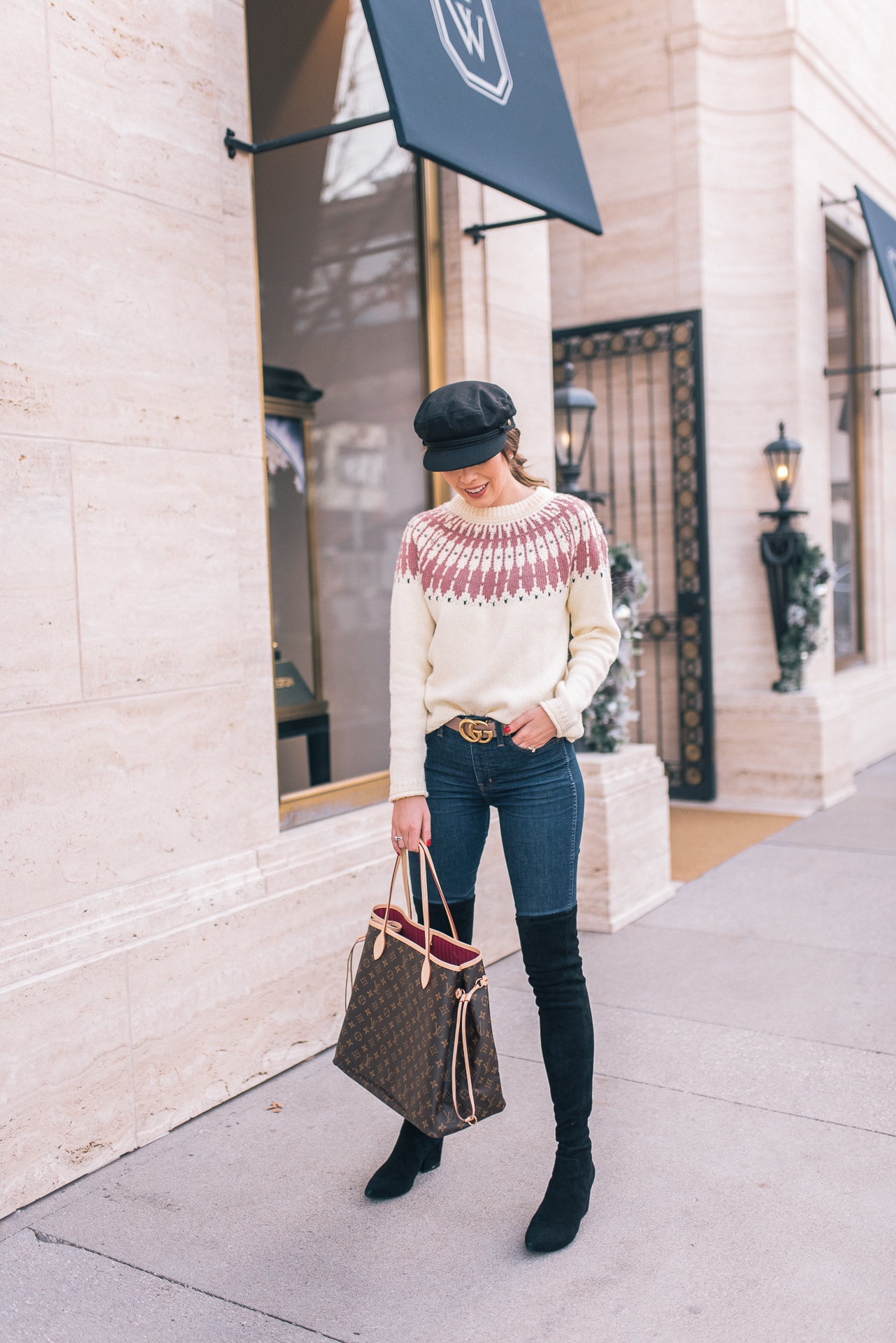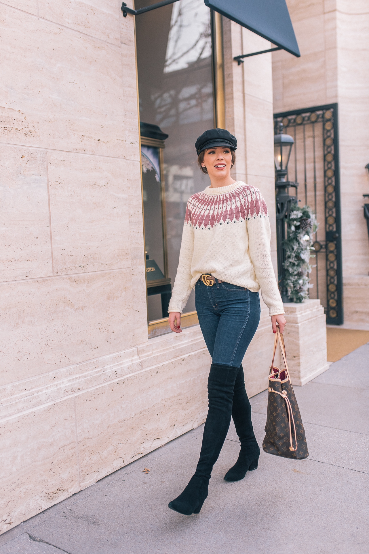Fair Isle Sweater: Madewell | Jeans: Madewell | OTK Boots: Goodnight Macaroon | Belt: Gucci | Bag: LV Neverfull GM | Hat: Nordstrom | Lip: MAC ( Color-Back to Vogue)