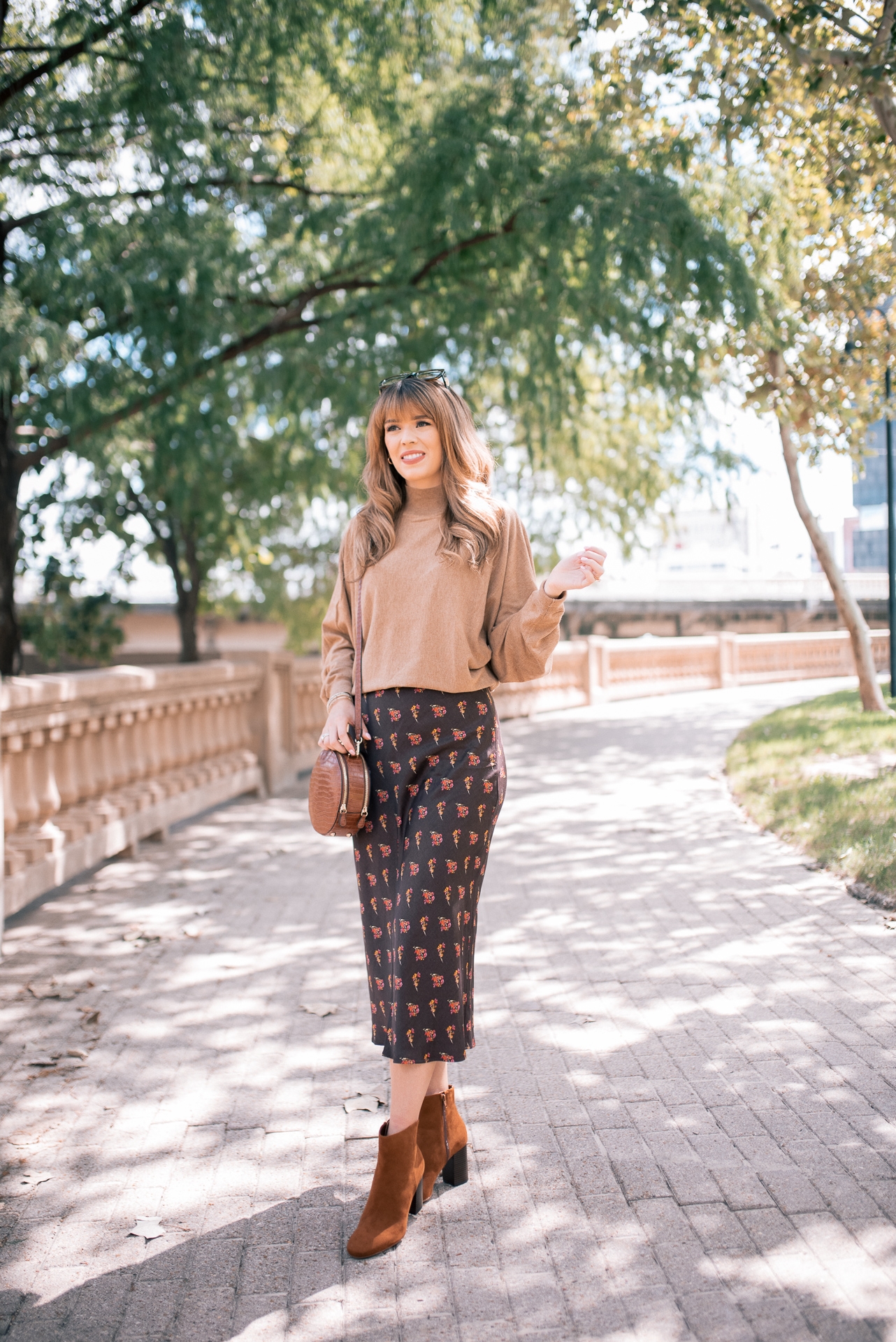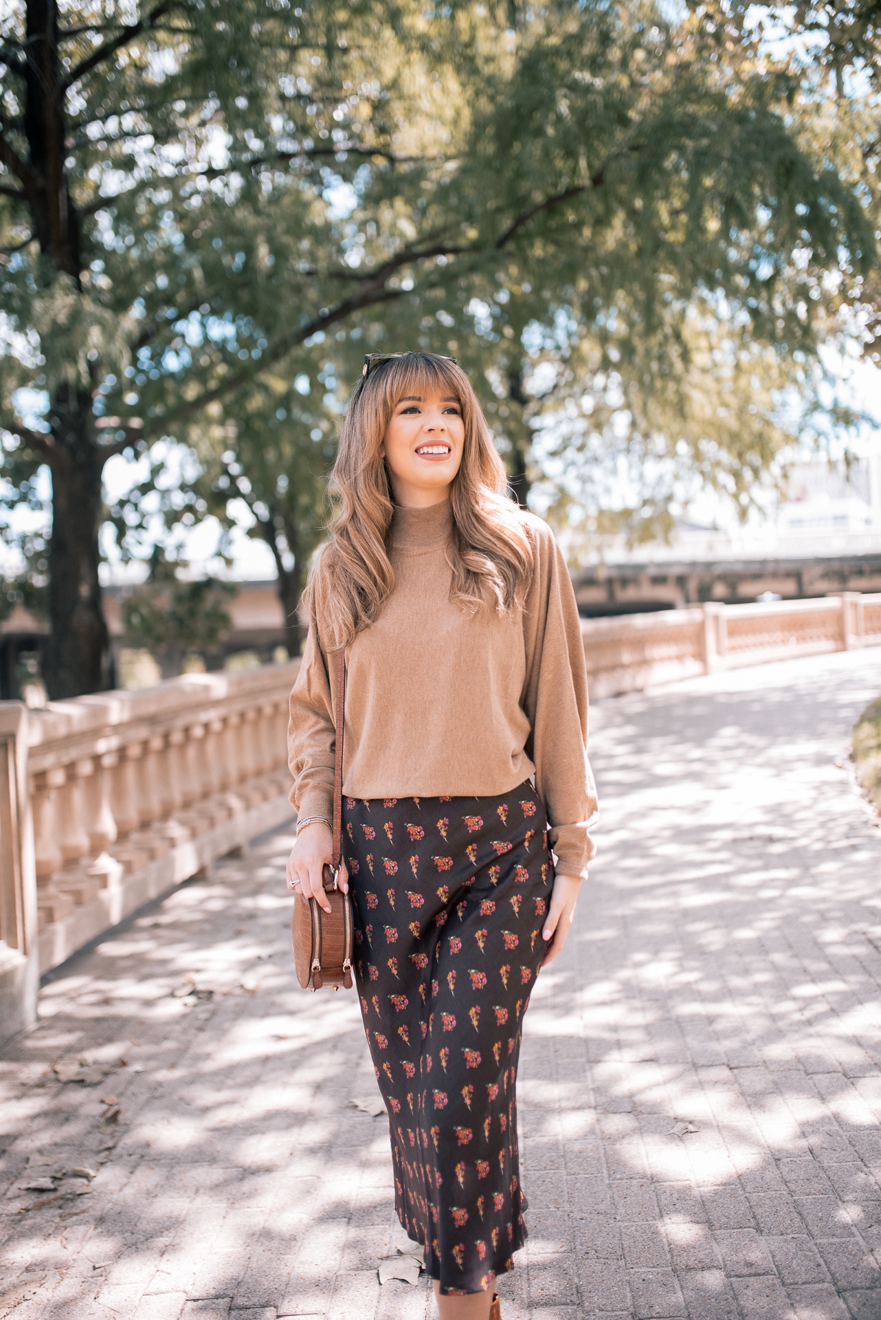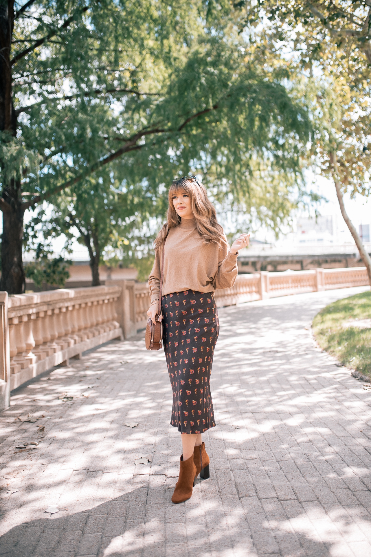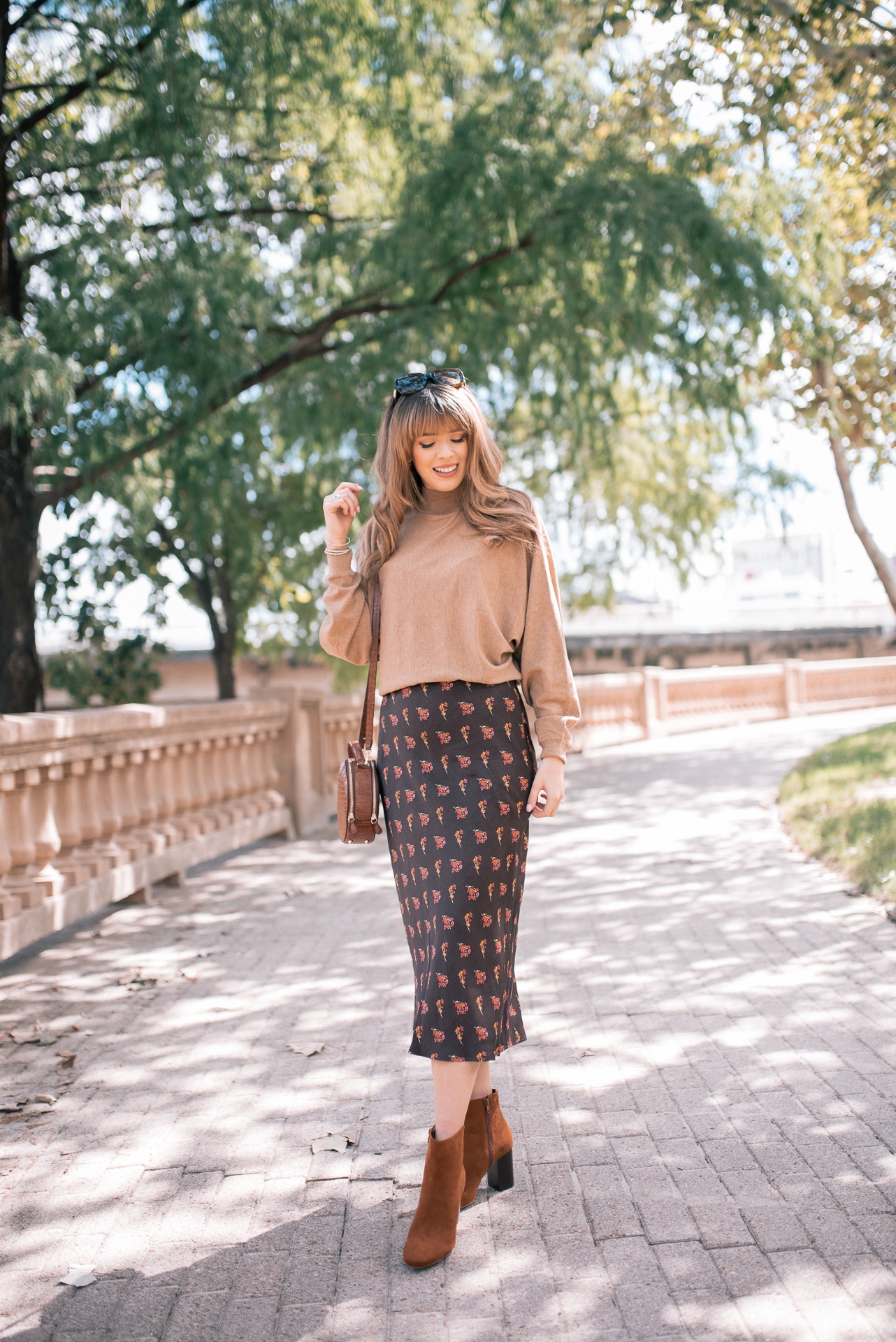 One of my favorite pieces to style this season is cute fall skirts! They are super easy to wear can can be worn in any climate. If you are like me living in “hot” fall weather or if you are lucky enough to have a beautiful “cooler” fall season you can style and layer these skirts either way. No matter what these are pieces to love and wear this season. So I have rounded up some of the cutest fall skirts from satin, to plaid and floral.