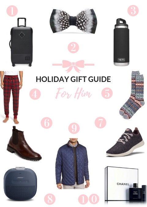 A few gifts that are currently on Hunters wishlist this year include, these gorgeous Frye boots, this Bose bluetooth speaker, and this quilted Pete Millar vest . Some gifts that I have given him in the past that he has absolutely loved include this quilted Peter Millar Coat, Ray-Ban Wayfarer Sunnies , and Chanel Bleu Perfum travel set. If you are not quite sure what your guy wants this year ( sometimes they just will not tell you, right?! 😉 ) than these are some gifts that are safe a bet: Yeti Rambler, Mizzen & Main Shirt ( see a full review of Mizzen and Main shirts here . They are the best!), fun socks, shaving kit , or even a nice candle. It’s important to think practical when shopping for your guys. Though the gift may be simple it seems that they always love those the most. I know Hunter does. 🙂