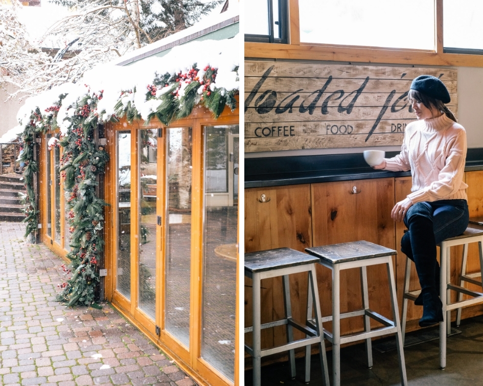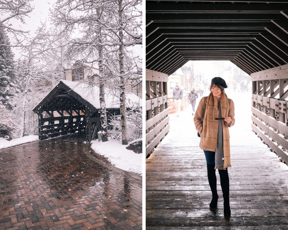 After brunch we began to explore through the falling snow. We of course, had to stop at the iconic covered bridge to snap a few photos. It is truly a breathtaking spot. Right around the corner from the bridge is Loaded Joes. We had heard such fun things about it and stopped in for a baileys and coffee for me and hot toddy for Hunter. After warming up we continued on exploring. A few of our favorite spots that we stopped at at, Root & Flower for a glass of wine, The Gilded Spruce for some Christmas ornaments and Gorsuch for the most magical shopping experience.